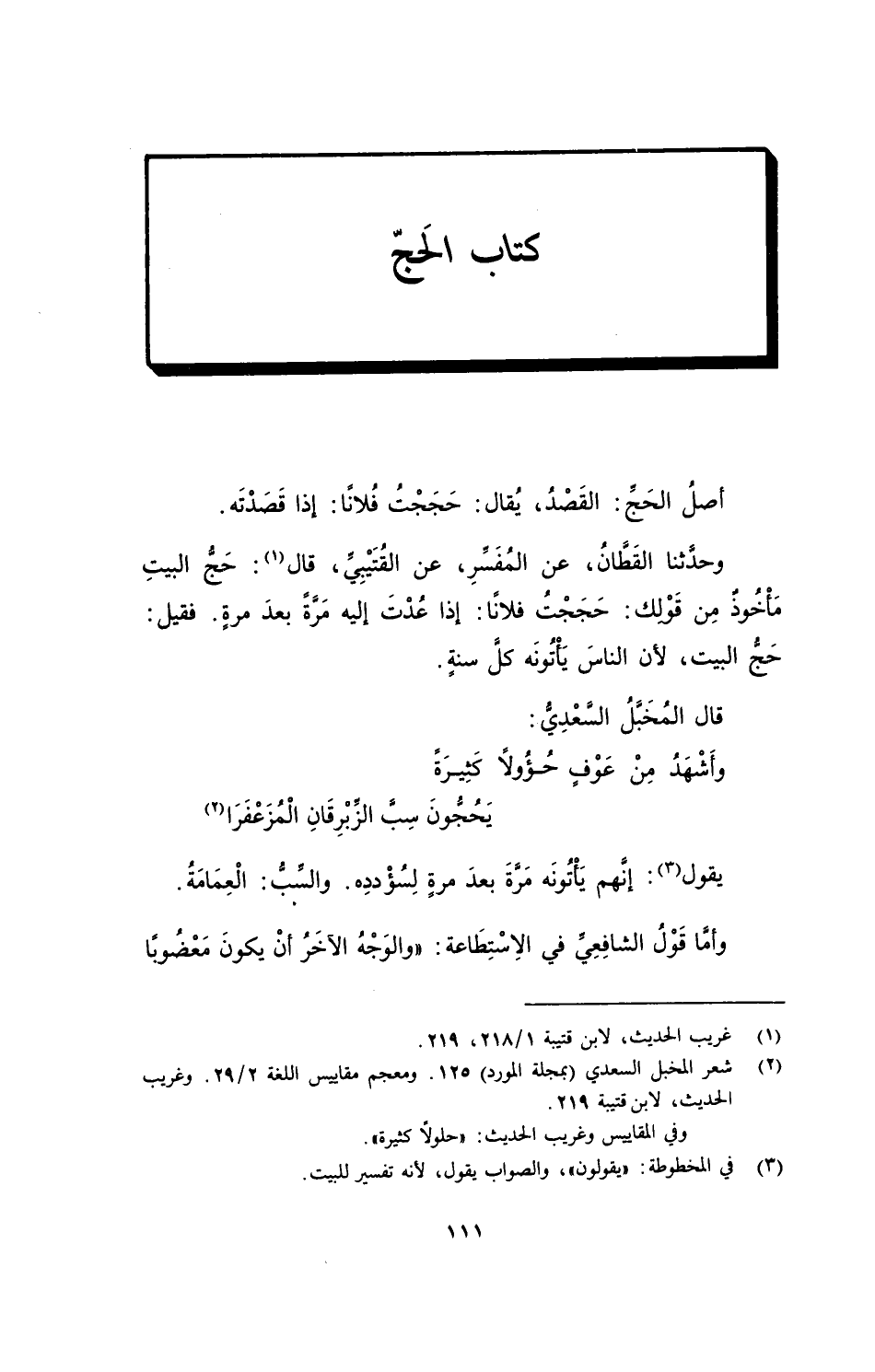 وحدَّثنا القَطَّانُ، عن المُفَسِّرِ، عن القُتَيْبِيِّ، قال: حَجُّ البَيْتِ مَاخوذٌ مِن قَوْلِكَ: حَجَجْتُ فلانًا: إذا عُدْتَ إليه مَرَّةً بعدَ مرةٍ. فقيل: حَجُّ البيت، لأن الناسَ يَاتُونَه كلَّ سَنَةٍ.