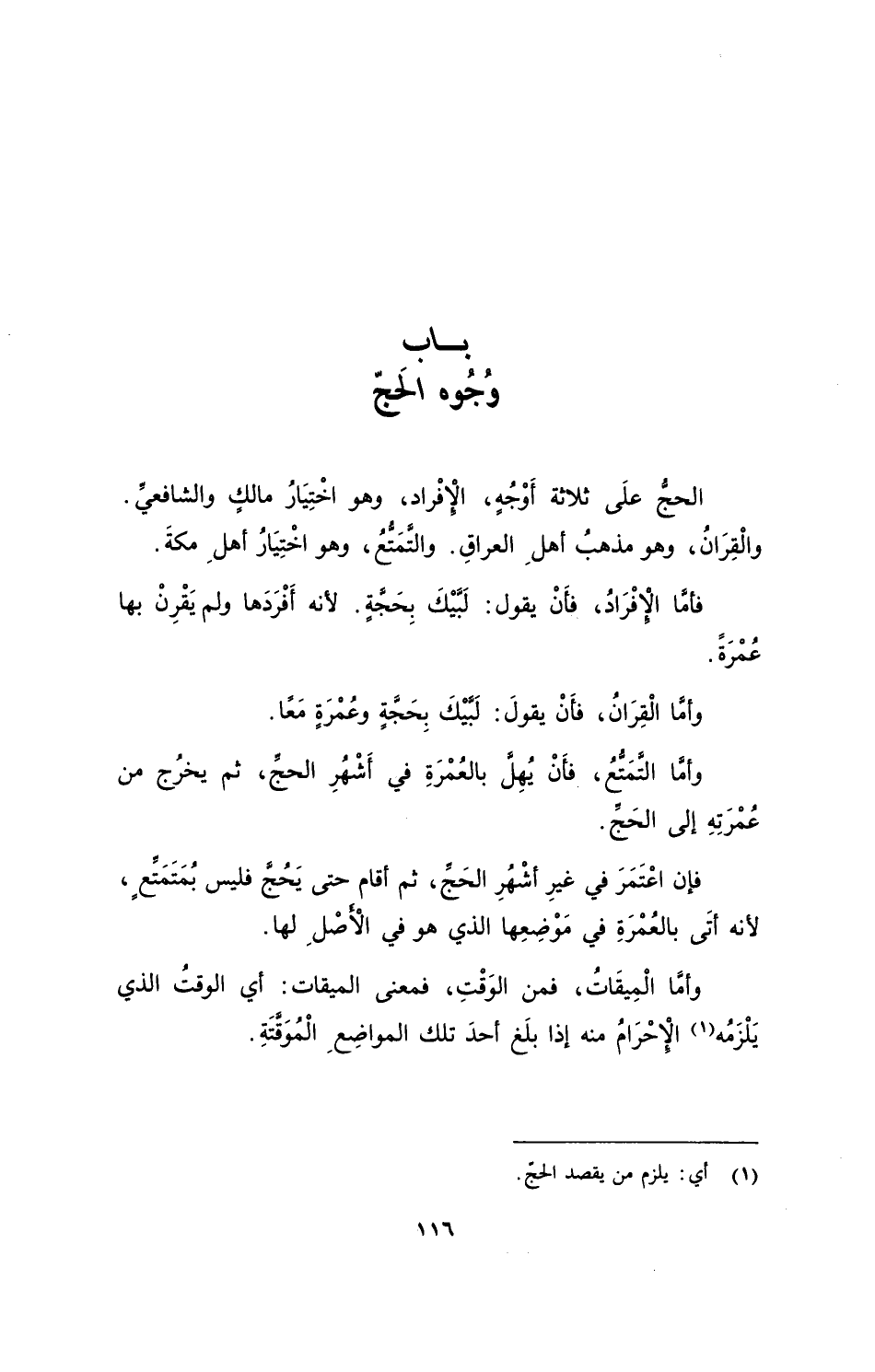 الحجُّ علَى ثلاثة أَوْجُهٍ، الْإِفْرَاد، وهو اخْتِيَارُ مالكٍ والشافعيِّ. والْقِرَانُ، وهو مذهبُ أهلِ العراقِ. والتَّمَتُّعُ، وهو اخْتِيَارُ أهلِ مكةَ.