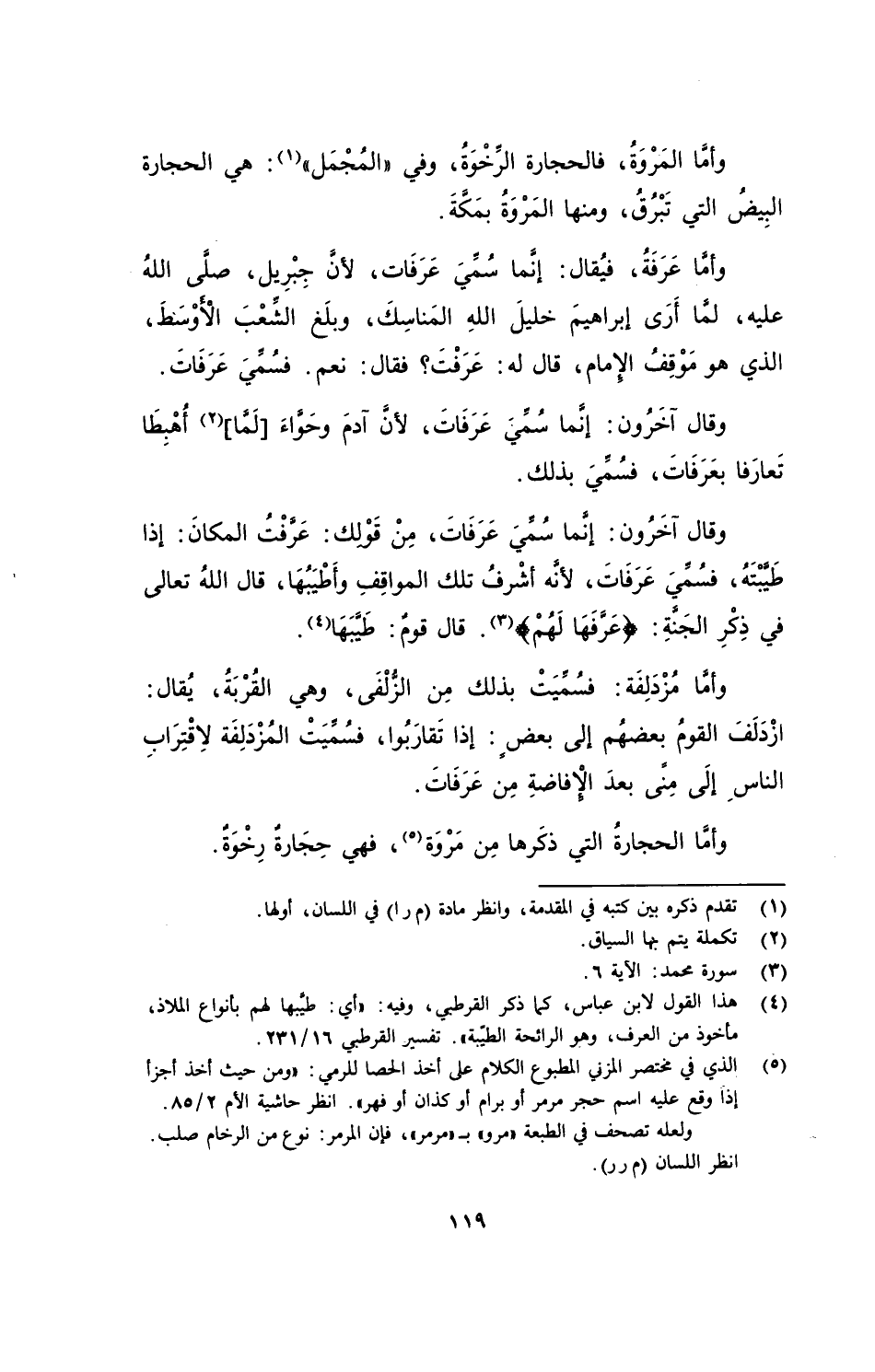 وأمَّا عَرَفَةُ، فيُقال: إنَّما سُمِّيَ عَرَفَات، لأنَّ جِبْريلَ، صَلَّى اللهُ عليه، لمَّا أَرَى إبراهيمَ خليلَ اللهِ المَناسِكَ، وبَلَغَ الشِّعْبَ الْأَوْسَطَ، الذي هو مَوْقِفُ الإِمام، قال له: عَرَفْتَ؟ فقال: نعم. فسُمِّيَ عَرَفَات.