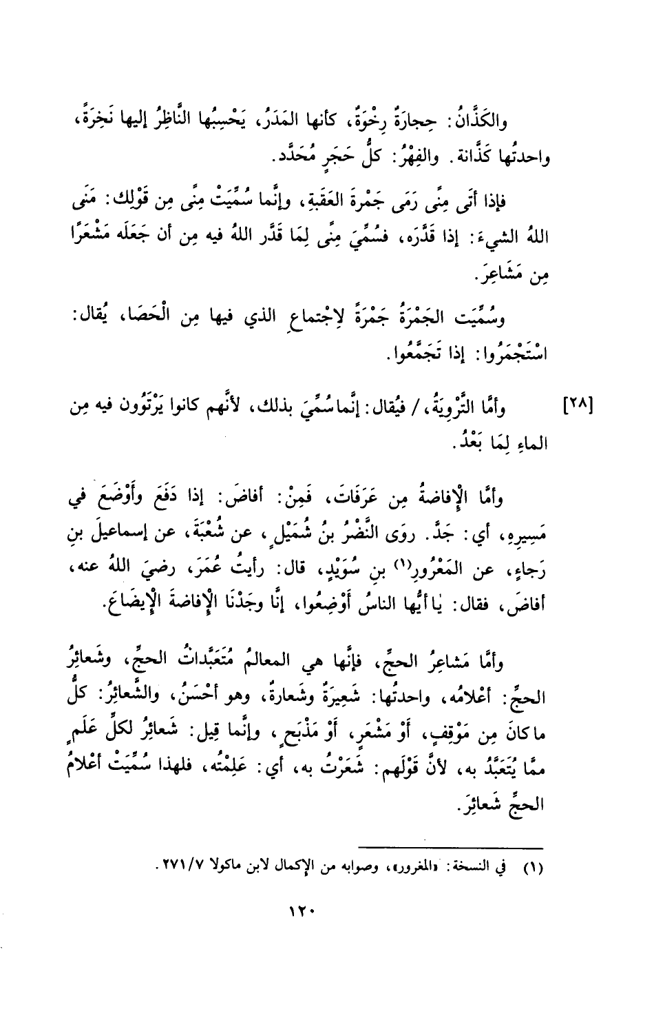 وأمَّا الْإفَاضَةُ مِن عَرَفَاتَ، فَمِنْ: أفاضَ: إذا دَفَعَ وأوْضَعَ في مَسِيرِه، أي: جَدَّ. رَوَى النَّضْرُ بنُ شُمَيْلٍ، عن شُعْبَةَ، عن إسماعيلَ بنِ رَجاءٍ، عن المَعْرُورِ بنِ سُوَيْدٍ، قال: رأيتُ عُمَرَ، رضيَ اللهُ عنه، أفاضَ، فقال: يا أيُّها الناسُ أَوْضِعُوا، إنَّا وَجَدْنا الْإفاضةَ الْإيضَاعَ.