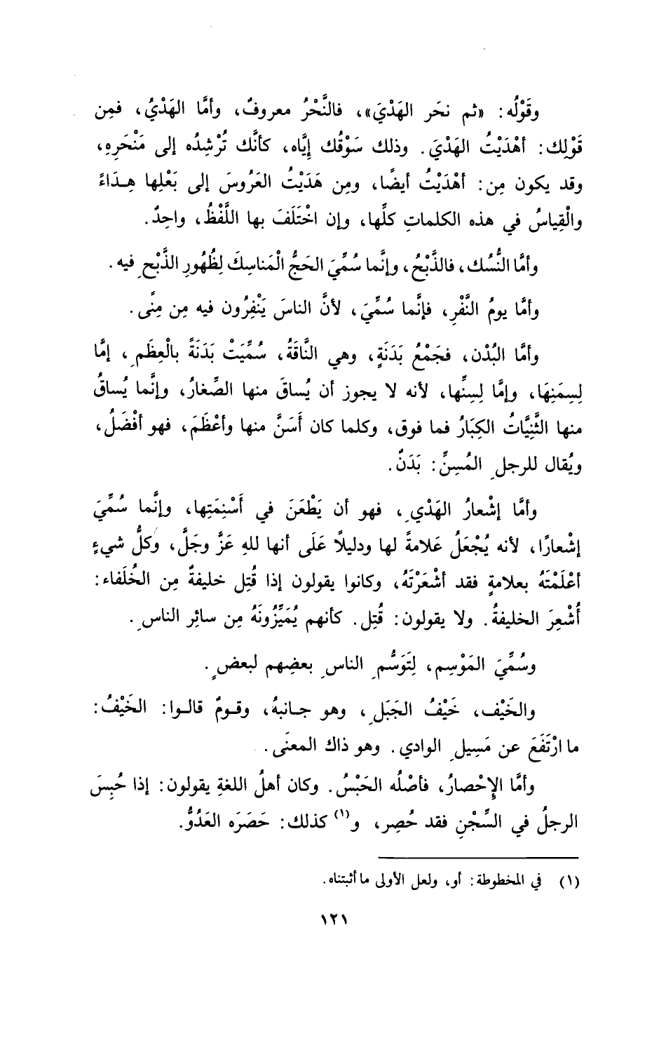 وأمَّا النُّسُك، فالذَّبْحُ، وإنَّما سُمِّيَ الحَجُّ الْمَناسِكَ لِظُهُورِ الذَّبْحِ فيه. وأمَّا يومُ النَّفْرِ، فإنَّما سُمِّيَ، لأنَّ الناسَ يَنْفِرُون فيه مِن مِنًى.