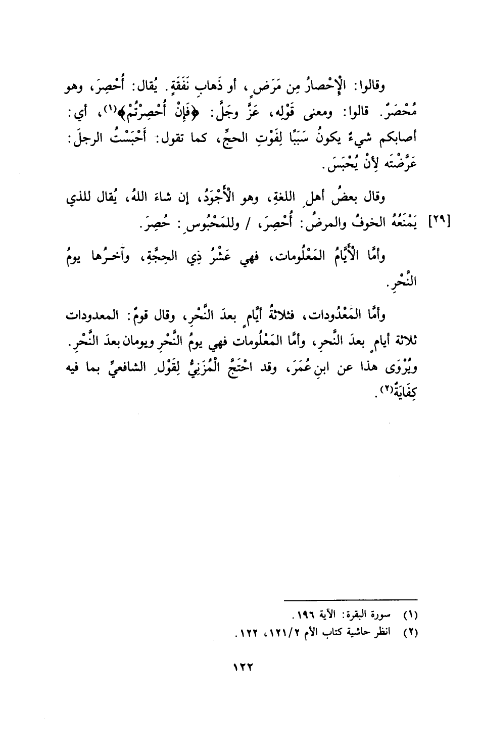 وقالوا: الْإحْصارُ مِن مَرَضٍ، أو ذَهابِ نَفَقَةٍ. يُقال: أُحْصِرَ، وهو مُحْصَرٌ. قالوا: ومعنى قَوْلِه، عَزَّ وجَلَّ (فإن أحصرتم)، أي: أصابكم شيءُ يكونُ سَبَبًا لِفَوْتِ الحَجِّ، كما تقول: أحْبَسْتُ الرجلَ: عَرَّضْتَه لِأنْ يُحْبَسَ.
