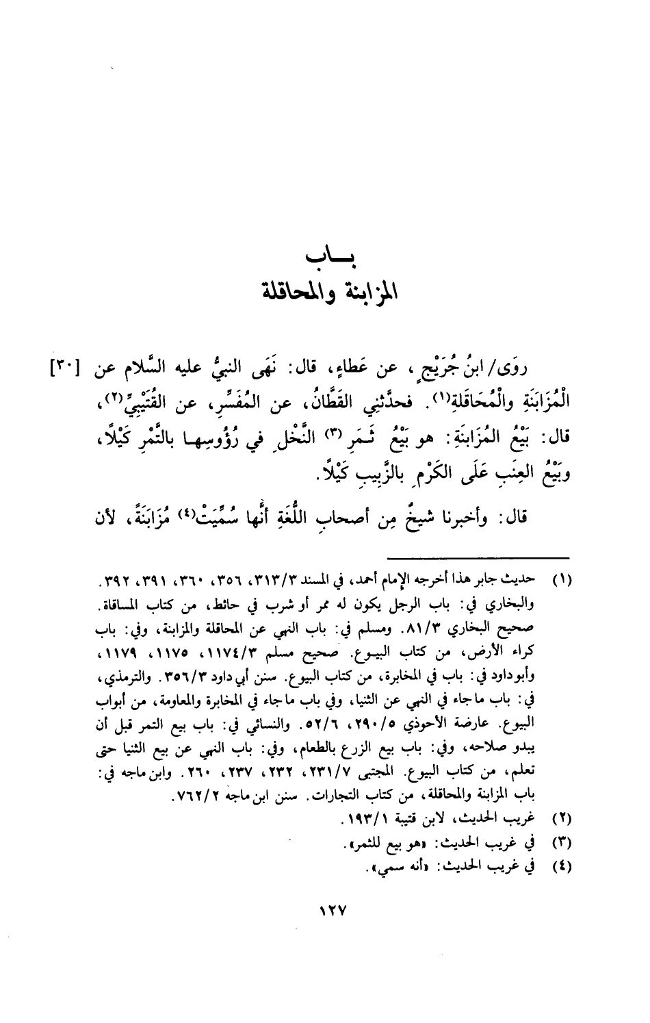 رَوَى ابنُ جُرَيْجٍ، عن عَطاءٍ، قال: نَهَى النبيُّ عليه السَّلام عن الْمُزَابَنَةِ والْمُحاقَلةِ. فحدَّثني القَطَّانُ، عن المُفَسِّرِ، عن القُتَيْبِيِّ، قال: بَيْعُ المُزَابَنَةِ: هو بَيْعُ ثَمَرِ النَّخْلِ في رُؤُوسِها بالتَّمْرِ كَيْلاً، وبَيْعُ العِنَبِ علَى الكَرْمِ بالزَّبِيبِ كَيْلاً.