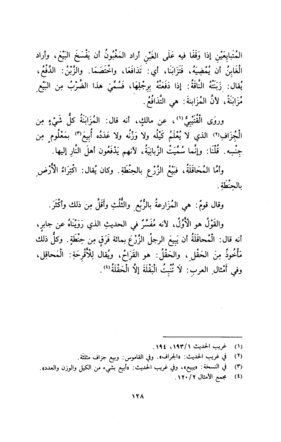 وأمَّا المُحاقَلَةُ، فبَيْعُ الزَّرْعِ بالحِنْطَةِ. وكان يُقال: اكْتِرَاءُ الْأَرْضِ بالحِنْطَةِ.