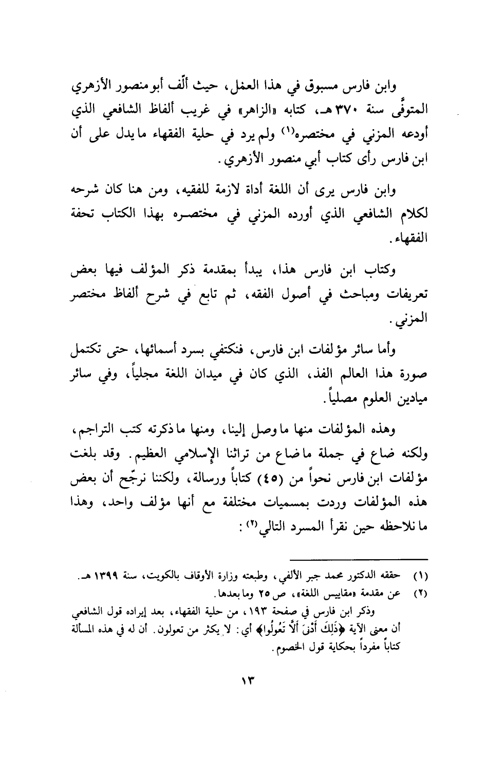 وابن فارس يرى أن اللغة أداة لازمة للفقيه، ومن هنا كان شرحه لكلام الشافعي الذي أورده المزني في مختصره بهذا الكتاب تحفة الفقهاء.