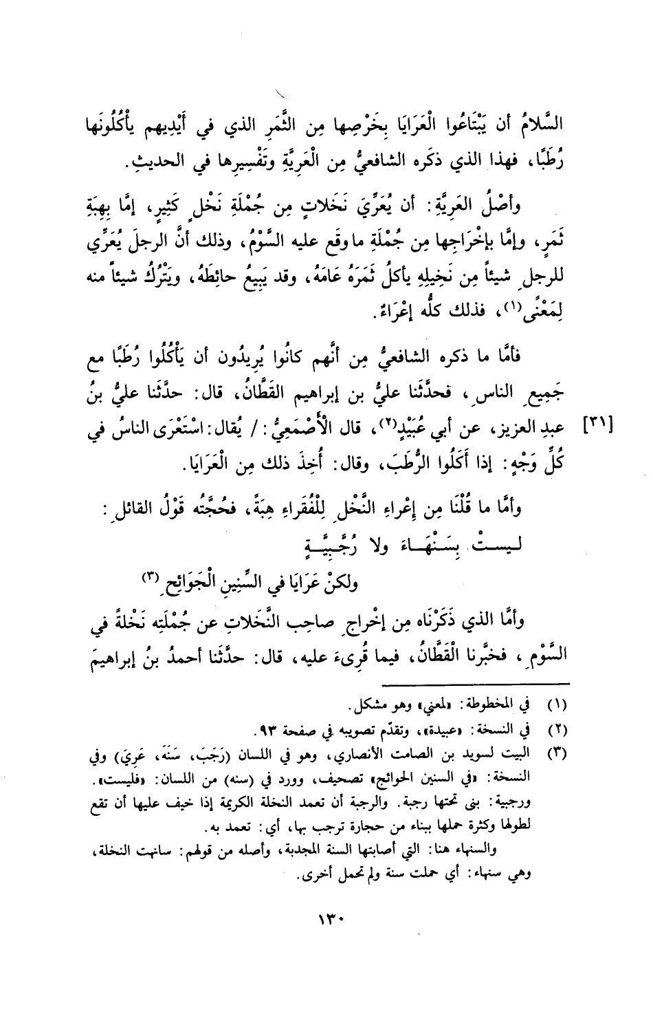 فأمَّا ما ذكره الشافعيُّ مِن أنَّهم كانُوا يُريدون أن يَأكُلُوا رُطَبًا مع جَمِيعِ الناسِ، فحدَّثَنا عليُّ بن إبراهيم القَطَّانُ، قال: حدَّثَنا عليُّ بنُ عبدِ العزيز، عن أبي عُبَيْدٍ، قال الْأَصْمَعِيُّ: يُقال: اسْتَعْرَى الناسُ في كُلِّ وَجْهٍ: إذا أَكَلُوا الرُّطَبَ، وقال: أُخِذَ ذلك مِن الْعَرَايَا.