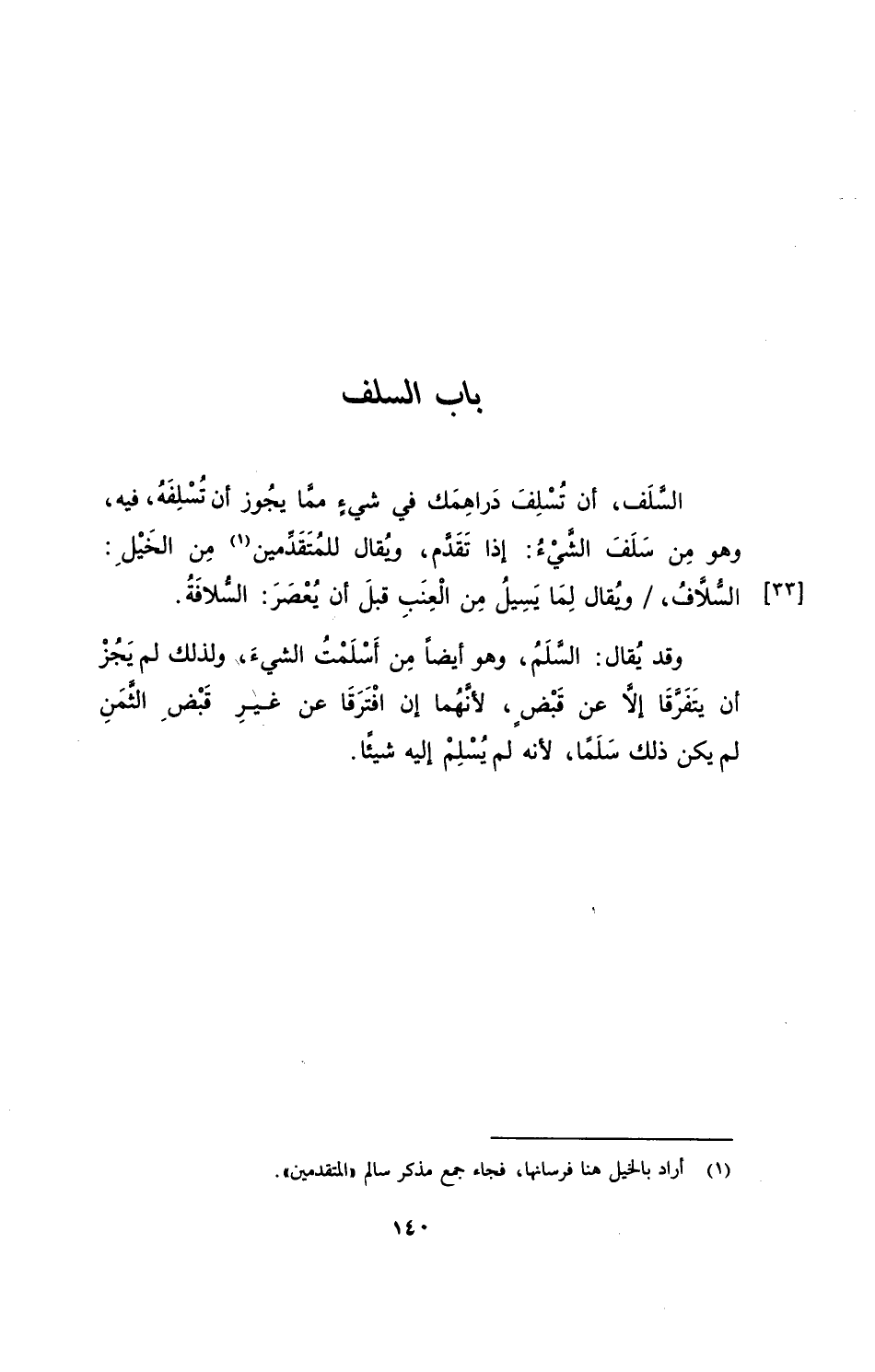وقد يُقال: السَّلَمُ، وهو أيضًا مِن أسْلَمْتُ الشيءَ، ولذلك لم يَجُزْ أن يتَفَرَّقَا إلاَّ عن قَبْضٍ، لأنَّهُما إن افْتَرَقَا عن غيرِ قَبْضِ الثَّمَنِ لم يكن ذلك سَلَمًا، لأنه لم يُسْلِمْ إليه شيئًا.