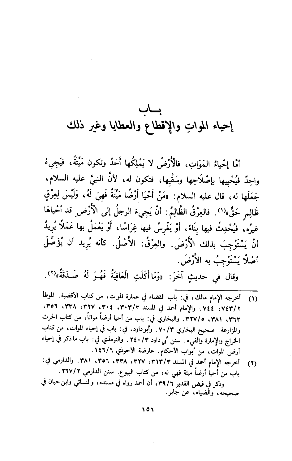أمَّا إحْياءُ المَوَاتِ، فالْأرْضُ لا يَمْلِكُها أحَدٌ وتكون مَيِّتَةً، فيَجِيءُ واحِدٌ فيُحْيِيها بإصْلاحِها وسَقْيِها، فتكون له، لأنَّ النبيَّ عليه السلام، جَعَلَها له، قال عليه السلام: "مَنْ أحْيَا أرْضًا مَيِّتَةً فَهِيَ لَهُ، ولَيْسَ لِعِرْقٍ ظَالِمٍ حَقٌّ". فالعِرْقُ الظَّالِمُ: أنْ يَجِيءَ الرجلُ إلى الْأرْضِ قد أحْياهَا غيرُه، فيُحْدِثُ فيها بِنَاءً، أوْ يَغْرِسُ فيها غِرَاسًا، أوْ يَعْمَلُ بها عَمَلاً يُريدُ أنْ يَسْتَوْجِبَ بذلك الْأرْضَ. والعِرْقُ: الأَصْلُ. كأنه يُريد أن يُؤَصِّلَ أصْلاً يَسْتَوْجِبُ به الأرْضَ.
