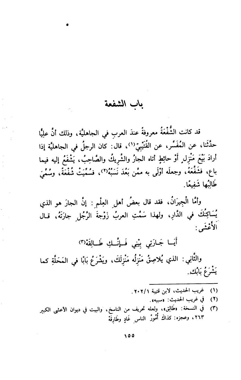 قد كانت الشُّفْعَةُ معروفةً عندَ العربِ في الجاهليَّة، وذلك أنَّ علِيًّا حدَّثَنا، عن المُفَسِّر، عن القُتَيْبِيِّ، قال: كان الرجلُ في الجاهليَّة إذا أرادَ بَيْعَ مَنْزِلٍ أوْ حائِطٍ أتاه الجارُ والشَّرِيكُ والصَّاحِبُ، يَشْفَعُ إليه فيما باع، فشَفَّعَهُ، وجعلَه أولَى به ممَّن بَعُدَ نَسَبُهُ، فسُمِّيَتْ شُفْعَةً، وسُمِّيَ طالبُها شَفِيعًا.