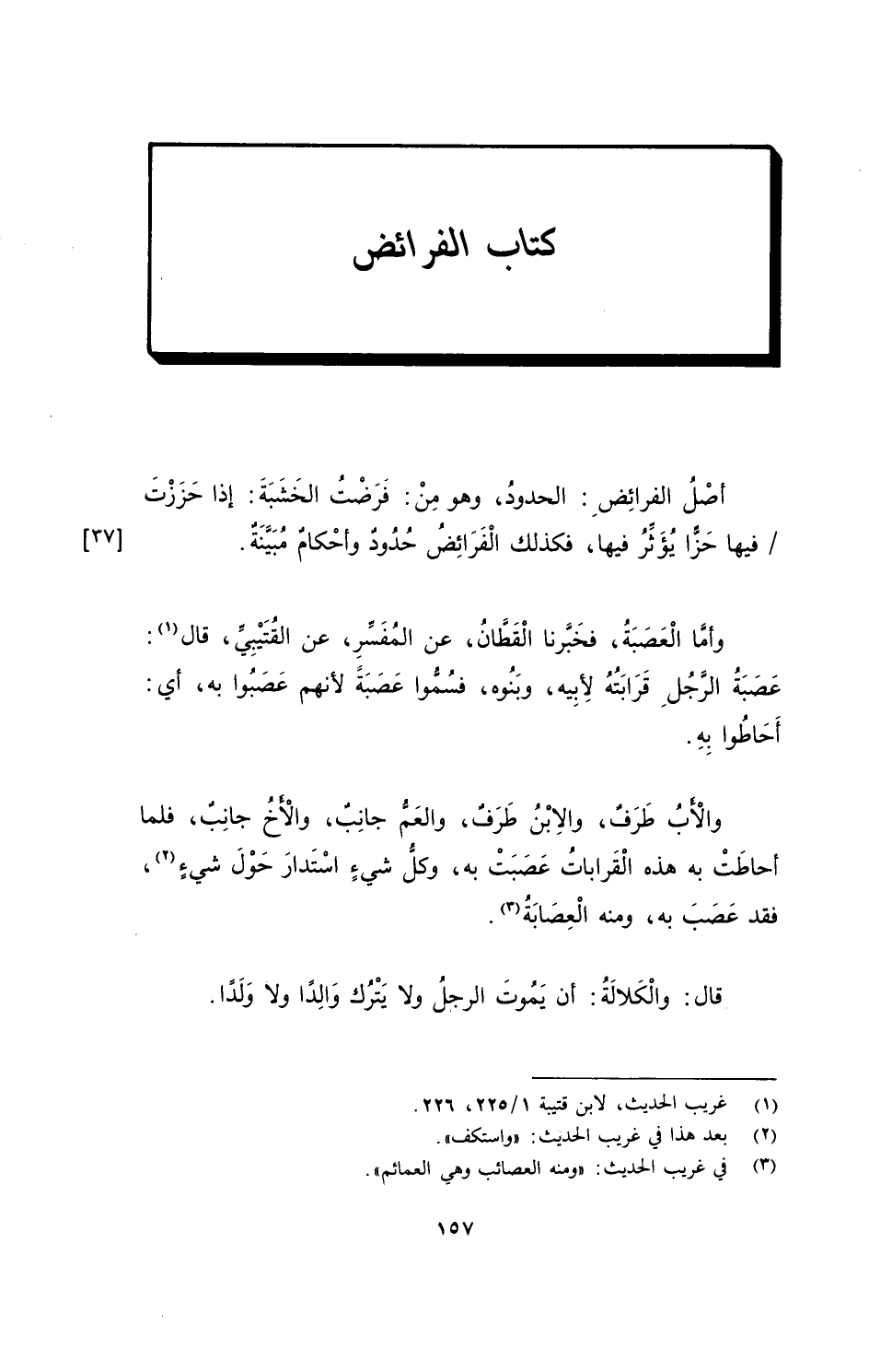 وأمَّا الْعَصَبَةُ، فخَبَّرَنا الْقَطَّانُ، عن المُفَسِّر، عن القُتَيْبِيِّ، قال: عَصَبَةُ الرَّجُلِ قَرَابَتُهُ لأبِيهِ، وبَنُوه، فسُمُّوا عَصَبَةً لأنهم عَصَبُوا به، أي: أحَاطُوا بِهِ.