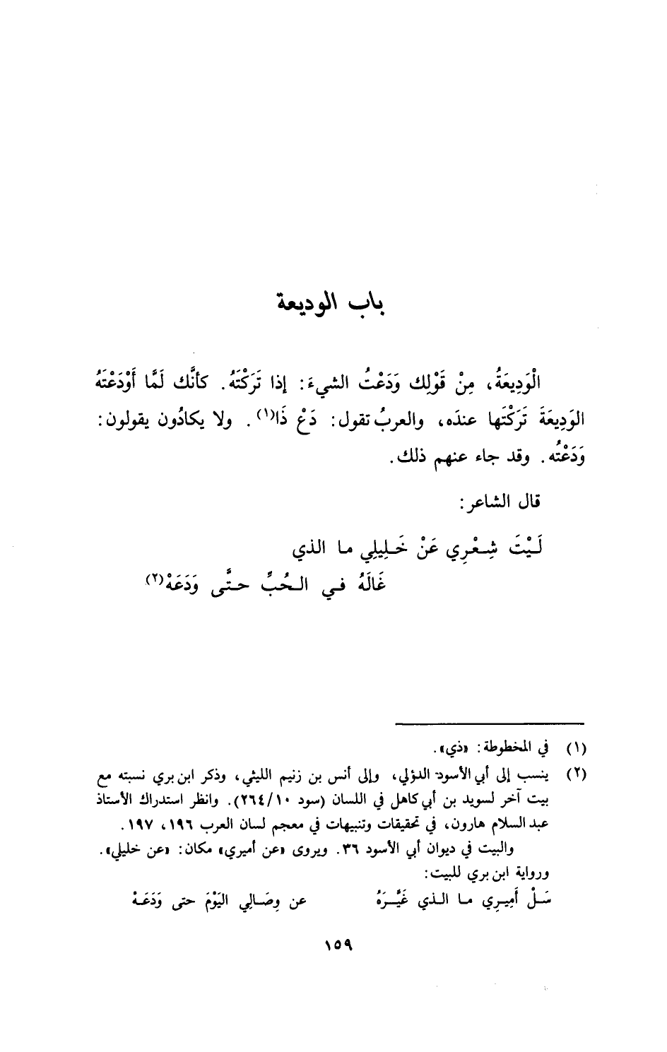الْوَدِيعَةُ، مِن قَوْلِكَ وَدَعْتُ الشيءَ: إذا تَرَكْتَهُ. كأنَّك لَمَّا أوْدَعْتَهُ الوَدِيعَةَ تَرَكْتَها عندَه، والعربُ تقول: دَعْ ذَا. ولا يكادُون يقولون: وَدَعْتُه. وقد جاء عنهم ذلك.