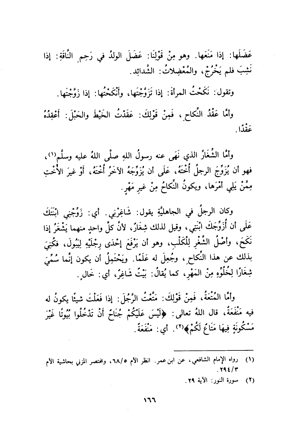 وكان الرجلُ في الجاهليَّةِ يقول: شَاغِرْنِي. أي: زَوِّجْنِي ابْنَتَكَ على أن أُزَوِّجَكَ ابْنَتِي، وقيل لذلك شِغَارٌ، لأنَّ كلَّ واحدٍ منهما يَشْغَرُ إذا نَكَحَ، وأصْلُ الشَّغْرِ لِلْكَلْبِ، وهو أن يَرْفَعَ إحْدَى رِجْلَيْهِ لِيَبُولَ، فكُنِيَ بذلك عن هذا النِّكاحِ، وجُعِلَ له عَلَمًا. ويَحْتَمِلُ أن يكون إنَّما سُمِّيَ شِغَارًا لِخُلُوِّهِ مِنَ المَهْرِ، كما يُقالُ: بَيْتٌ شَاغِرٌ، أي: خَالٍ.