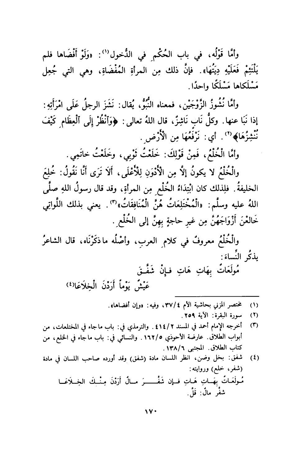 والْخُلْعُ لا يكونُ إلاَّ مِن الْأدْوَنِ لِلْأعْلَى، ألا تَرَى أنَّا نَقُولُ: خُلِعَ الخليفةُ. فلِذلك كان ابْتِداءُ الخُلْعِ مِن المرأةِ، وقد قال رسولُ اللهِ صلَّى اللهُ عليه وسلَّم: "الْمُخْتَلِعاتُ هُنَّ الْمُنافِقاتُ". يعني بذلك اللَّواتِي خَالَعْنَ أزْواجَهُنَّ مِن غَيْرِ حاجةٍ بِهِنَّ إلى الخُلْعِ.