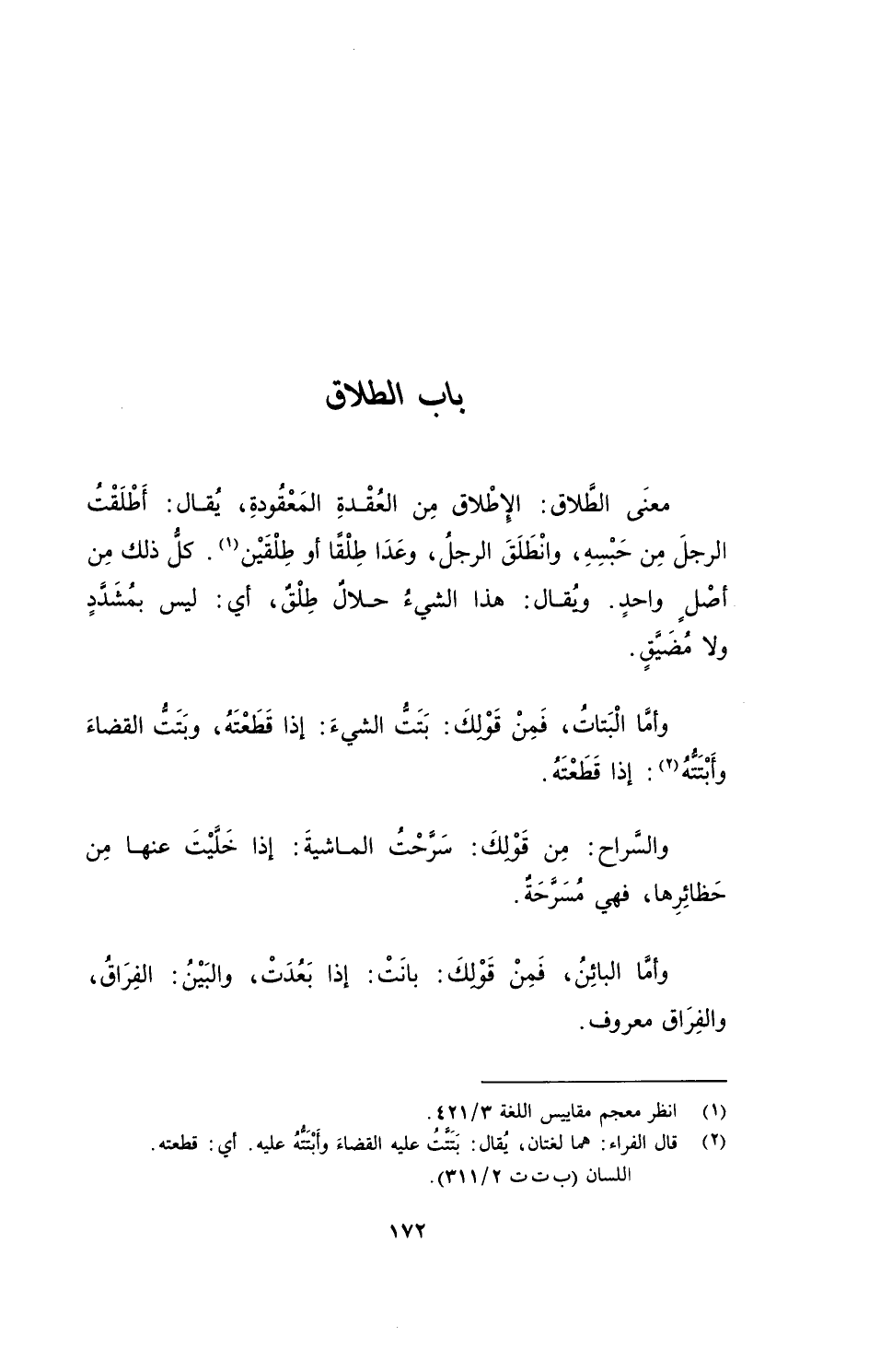 معنَى الطَّلاق: الإطْلاق مِن العُقْدةِ المَعْقُودَةِ، يُقال: أطْلَقْتُ الرجلَ مِن حَبْسِهِ، وانْطَلَقَ الرجلُ، وعَدَا طِلْقًا أو طِلْقَيْن. كلُّ ذلك مِن أصْلٍ واحدٍ. ويُقال: هذا الشيءُ حلالٌ طِلْقٌ، أي: ليس بمُشَدَّدٍ ولا مُضَيَّقٍ.