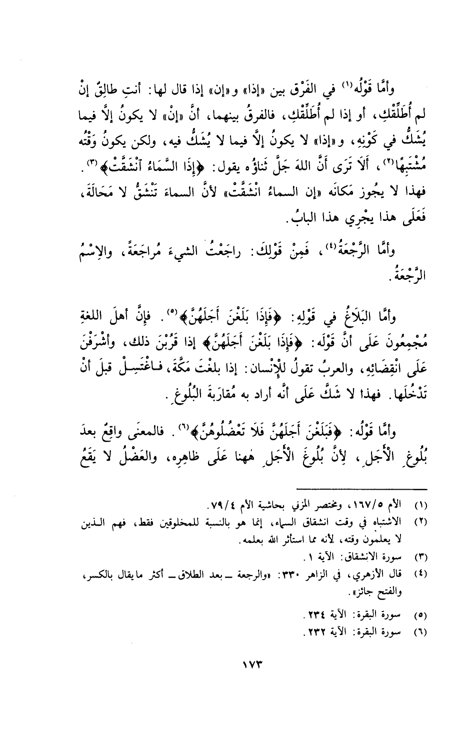 وأمَّا البَلاغُ في قَوْلِه: (فإذا بلغن أجلهن). فإنَّ أهلَ اللغةِ مُجْمِعُونَ على أنَّ قَوْلَه: (فإذا بلغن أجلهن) إذا قَرُبْنَ ذلك، وأشْرَفْنَ على انْقِضائِه، والعربُ تقولُ للْإنْسان: إذا بَلغْتَ مَكَّةَ، فاغْتَسِلْ قبلَ أنْ تدْخُلَها. فهذا لا شَكَّ على أنَّه أراد به مُقارَبَةَ البُلُوغِ.