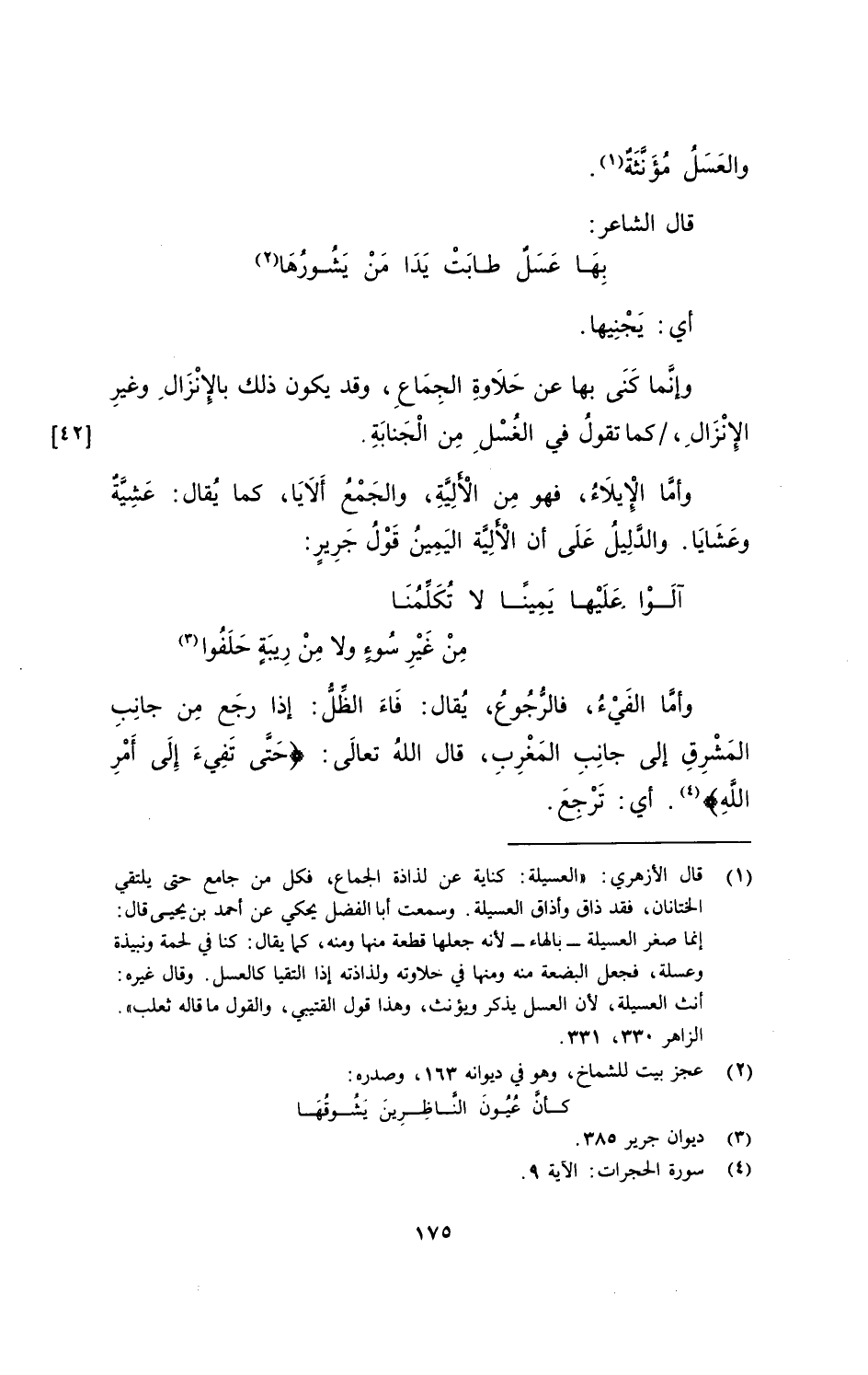 وأمَّا الْإيلاءُ، فهو مِن الْألِيَّةِ، والجَمْعُ ألايَا، كما يُقال: عَشِيَّةٌ وعَشَايَا. والدَّلِيلُ على أن الْألِيَّة اليَمِينُ قَوْلُ جَرِيرٍ: