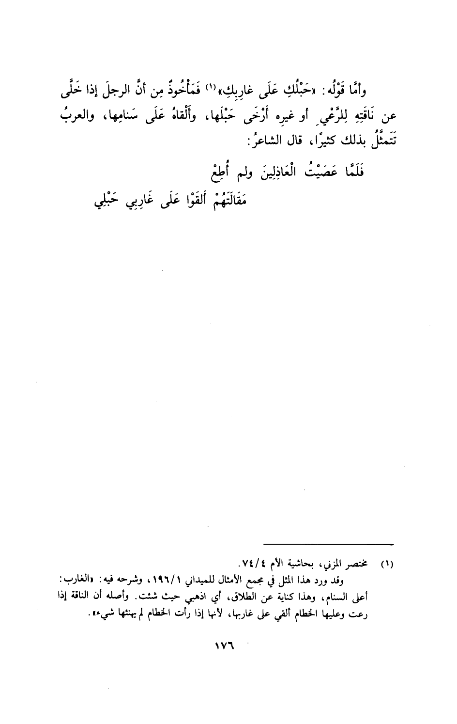 وأمَّا قَوْلُه: "حَبْلُكِ على غارِبِكِ" فمَأخُوذٌ مِن أنَّ الرجلَ إذا خَلَّى عن نَاقَتِهِ للرَّعْيِ أو غيرِه أرْخَى حَبْلَها، وألْقاه على سَنامِها، والعربُ تَتَمَثَّلُ بذلك كثيرًا، قال الشاعرُ: