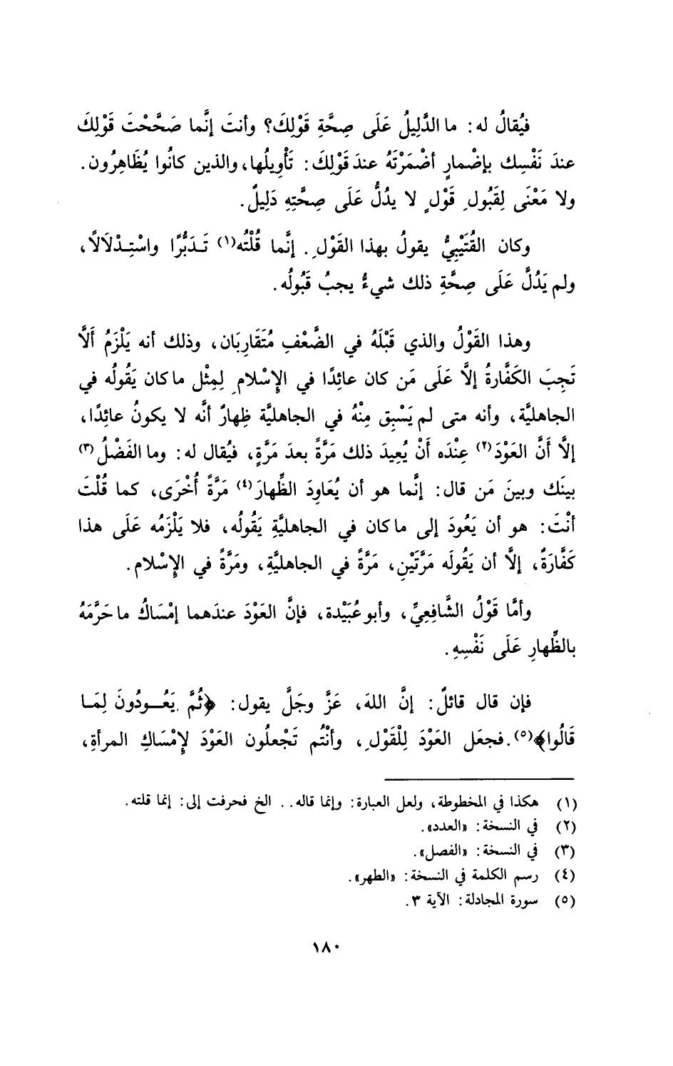 فإن قال قائلٌ: إنَّ اللهَ، عَزَّ وجَلَّ يقول: (ثُمَّ يعودون لما قالوا). فجعَل العَوْدَ لِلْقَوْلِ، وأنتُم تَجْعَلُون العَوْدَ لإمْساكِ المرأةِ،