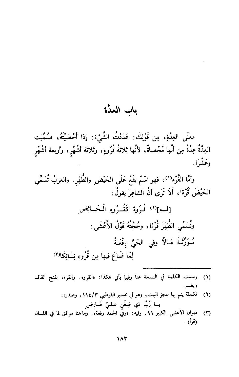 وأمَّا القُرْء، فهو اسْمٌ يَقَعُ عَلَى الحَيْضِ والطُّهْرِ. والعربُ تُسَمِّي الحَيْضَ قُرْءًا، ألا تَرَى أنَّ الشاعِرَ يقولُ: