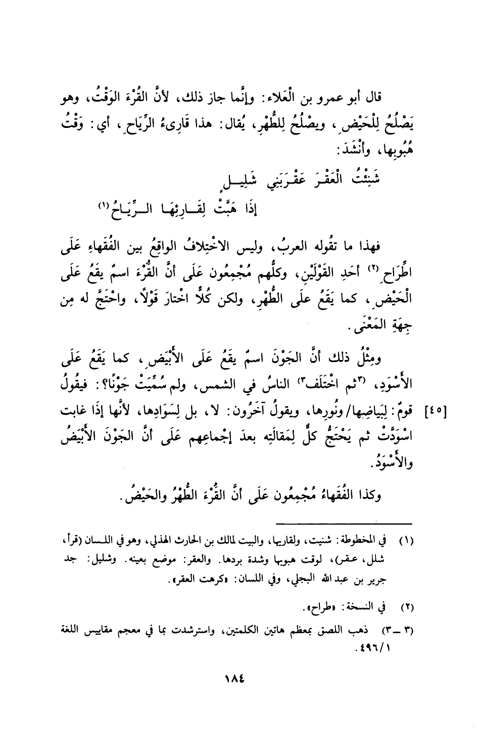 فهذا ما تقُوله العربُ، وليس الاخْتِلافُ الواقِعُ بين الفُقَهاءِ عَلى اطِّرَاحِ أحَدِ القَوْلَيْنِ، وكلُّهم مُجْمِعُون على أنَّ القُرْءَ اسمٌ يَقَعُ على الْحَيْضِ، كما يَقَعُ على الطُّهْرِ، ولكن كُلاَّ اخْتارَ قَوْلاً، واحْتَجَّ له مِن جِهَةِ المَعْنَى.