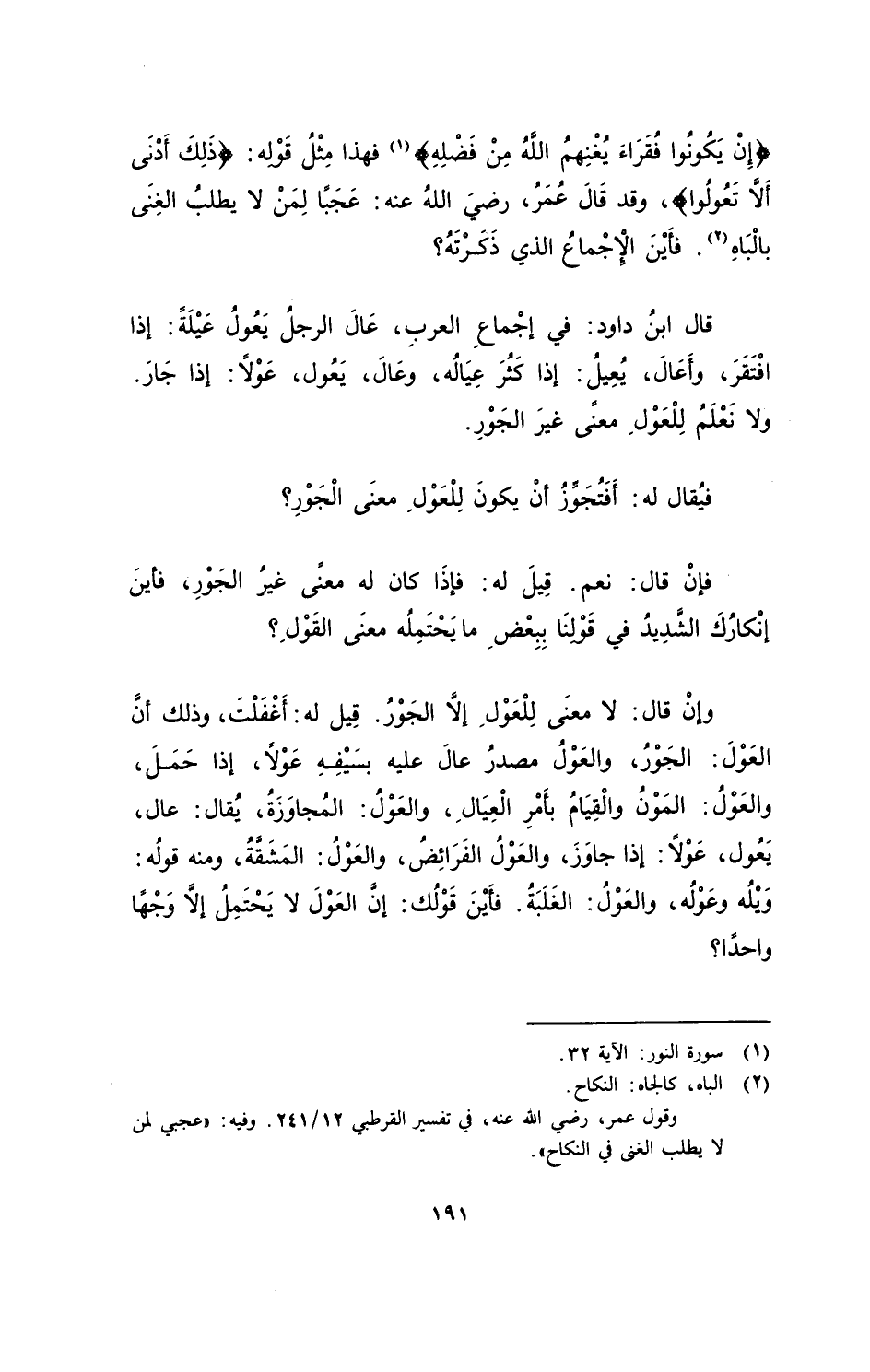 وإنْ قال: لا معنَى لِلْعَوْلِ إلاَّ الجَوْرُ، قِيلَ له: أغْفَلْتَ، وذلك أنَّ العَوْلَ: الجَوْرُ، والعَوْلُ مصدرُ عالَ عليه بسَيْفِهِ عَوْلاً، إذا حَمَلَ، والعَوْلُ: المَوْنُ والْقِيامُ بأَمْرِ الْعِيالِ، والعَوْلُ: المُجاوَزَةُ، يُقال: عال، يَعُول، عَوْلاً: إذا جاوَزَ، والعَوْلُ الفَرائِضُ، والعَوْلُ: المَشَقَّةُ، ومنه قولُه: وَيْلُه وعَوْلُه، والعَوْلُ: الغَلَبَةُ. فَأيْنَ قَوْلُك: إنَّ العَوْلَ لا يَحْتَمِلُ إلاَّ وَجْهًا واحدًا؟