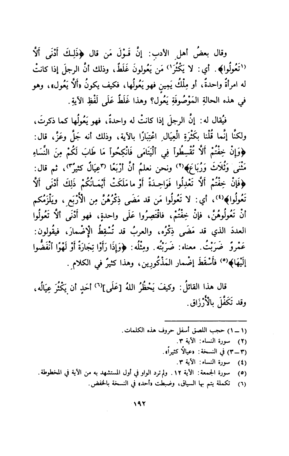 وقال بعضُ أهلِ الأدبِ: إنَّ قَوْلَ مَن قال: (ذلك أدنى ألا تعولوا). أي: لا يَكْثُرَ مَن يَعُولُون غَلَطٌ، وذلك أنَّ الرجلَ إذا كانتْ له امرأةٌ واحدةٌ، أو مِلْكُ يَمِينٍ فهو يَعُولُها، فكيف يكونُ "ألاَّ يَعُول"، وهو في هذه الحالةِ المَوْصُوفَةِ يَعُول؟ وهذا غَلَطٌ على لَفْظِ الآيةِ.