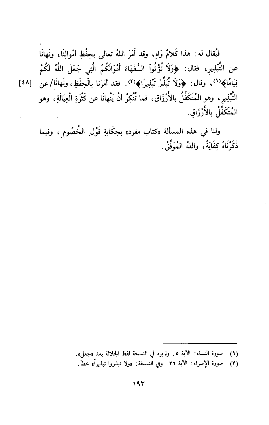 ولنا في هذا المسألة "كتاب مفرد" بحِكايَةِ قَوْلِ الخُصُومِ، وفيما ذَكَرْنَاهُ كِفَايَةٌ، واللهُ المُوَفِّقُ.