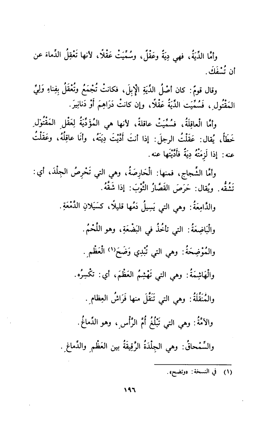 وأمَّا الدِّيَةُ، فهي دِيَةٌ وعَقْلٌ، وسُمِّيَتْ عَقْلاً، لأنها تَعْقِلُ الدِّماءَ عن أن تُسْفَكَ.