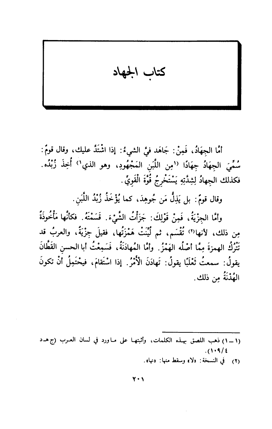 أمَّا الجِهادُ: فَمِنْ: جاهَدَ فيَّ الشيءُ: إذا اشْتَدَّ عليك، وقال قومٌ: سُمِّيَ الجِهادُ جِهادًا مِن اللَّبَنِ المَجْهُودِ، وهو الذي أُخِذَ زُبْدُه. فكذلك الجِهادُ لِشِدَّتِهِ يَسْتَخْرِجُ قُوَّةَ الْقَوِيِّ.