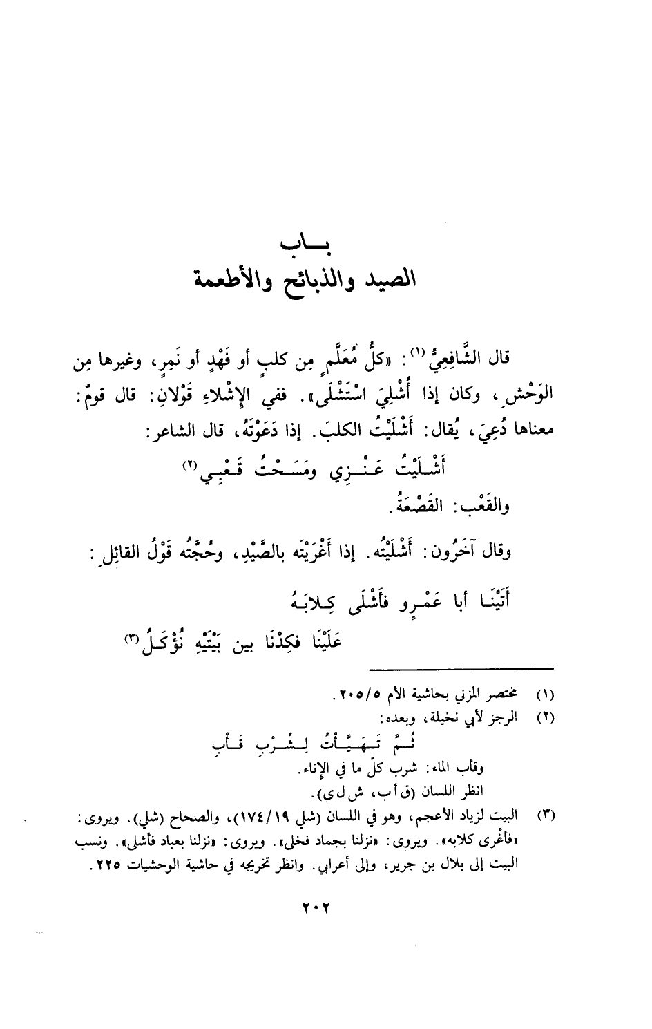 قال الشَّافِعِيُّ: "كلُّ مُعَلَّمٍ مِن كلبٍ أو فَهْدٍ أو نَمِرٍ، وغيرها مِن الوَحْشِ، وكان إذا أُشْلِيَ اسْتَشْلَى". ففي الإشْلاءِ قَوْلانِ: قال قومٌ: معناها دُعِيَ، يُقال: أَشْلَيْتُ الكلبَ. إذا دَعَوْتَهُ، قال الشاعر: