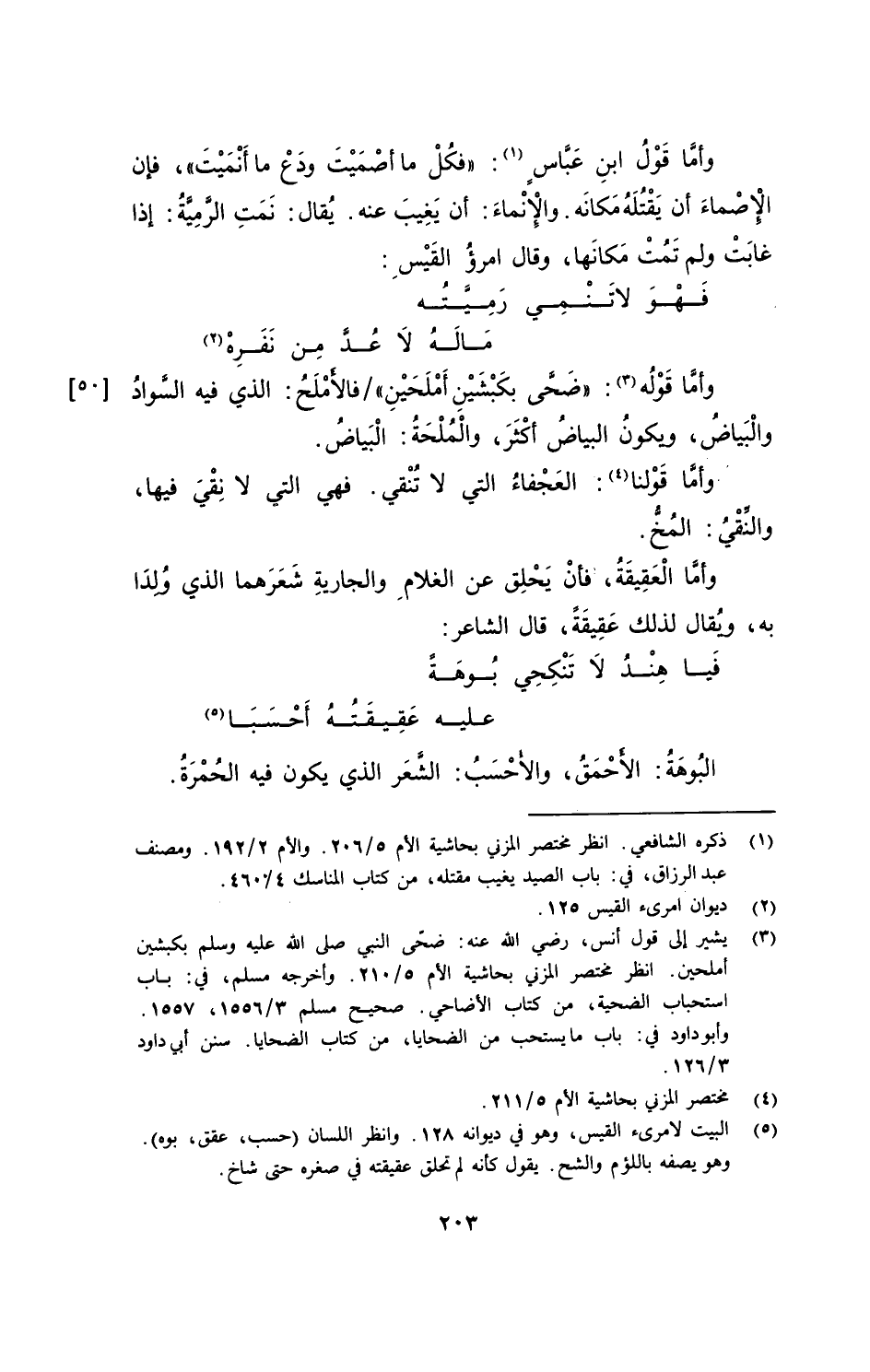 وأمَّا قَوْلُ ابنِ عَبَّاسٍ: "فكُلْ ما أصْمَيْتَ ودَعْ ما أنْمَيْتَ"، فإن الْإصْماءَ أن يَقْتُلَهُ مَكانَه. والْإِنْماءُ أن يغيبَ عنه. يُقال: نَمَتِ الرَّمِيَّةُ: إذا غابَتْ ولم تَمُتْ مَكانَها، وقال امرؤُ القَيْسِ: