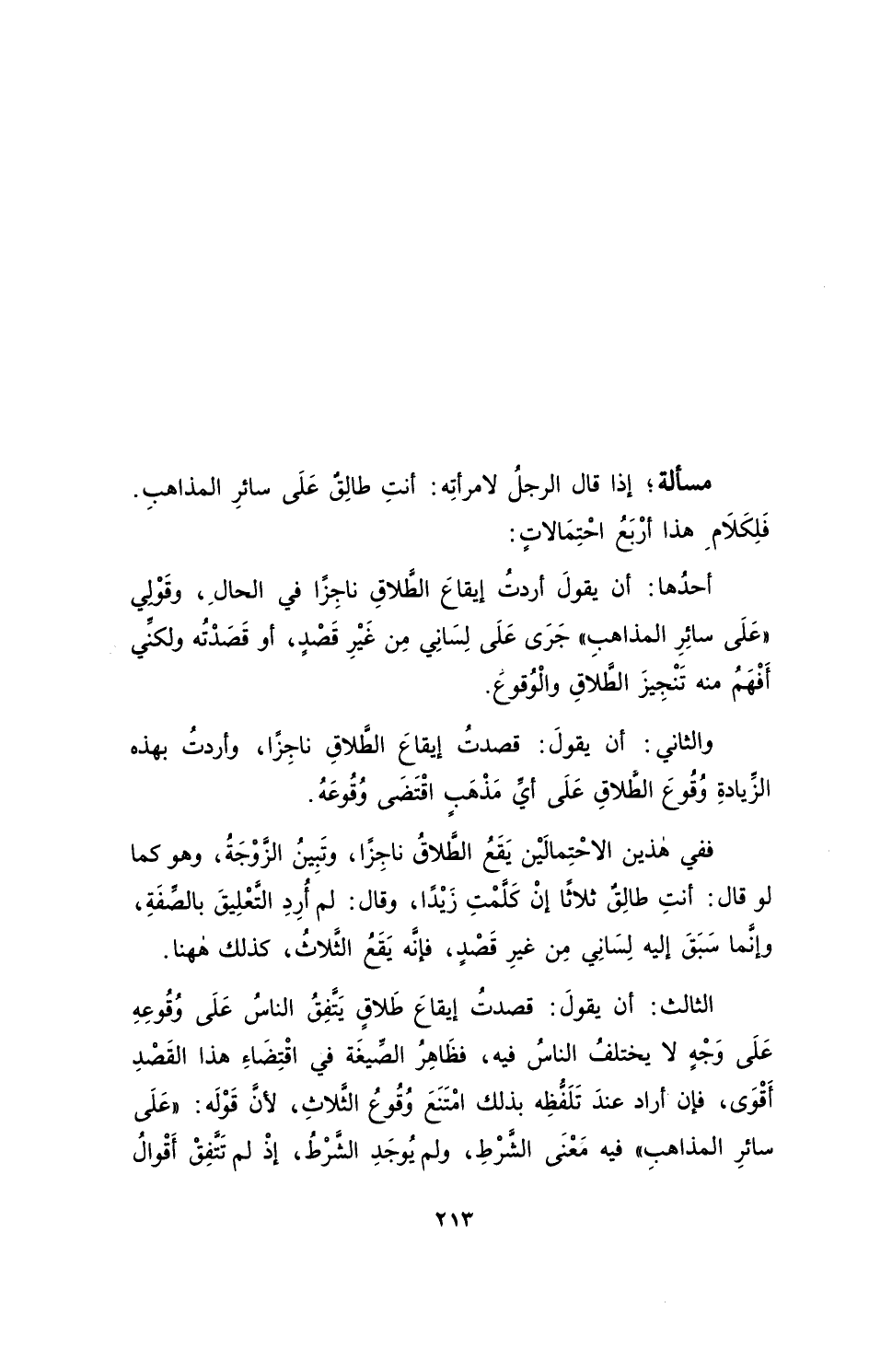 مسألة؛ إذا قال الرجلُ لامرأتِه: أنتِ طالِقٌ على سائرِ المذاهِبِ. فَلِكَلامِ هذا أرْبَعُ احْتِمالاتٍ: