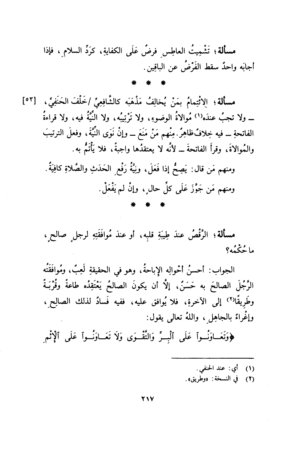 مسألة؛ الاِئْتِمامُ بمَنْ يُخالِفُ مَذْهَبَه كالشَّافِعِيِّ خَلْفَ الحَنَفِيِّ، ولا تجبُ عندَه مُوالاةُ الوضوءِ، ولا تَرْتِيبُه، ولا النِّيَّةُ فيه، ولا قراءةُ الفاتحةِ – فيه خلافٌ ظاهِرٌ. مِنْهم مَنْ مَنَعَ – وإنْ نَوَى النِّيَّةَ، وفعَلَ الترتيبَ والمُوالاةَ، وقرأَ الفاتحةَ – لأنَّه لا يعتقدُها واجبةً، فلا يَاتَمُّ به.
