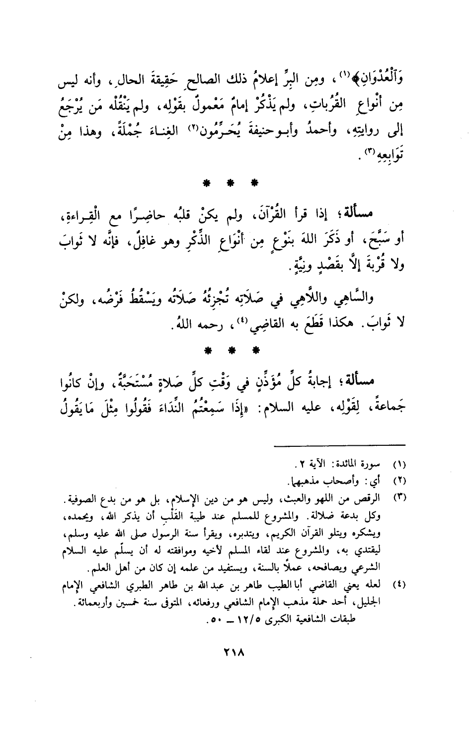 والعدوان)، ومِن البِرِّ إعلامُ ذلك الصالحِ حَقِيقَةَ الحالِ، وأنه ليس مِن أنْواعِ الْقُرُباتِ، ولم يَذْكُرْ إمامٌ مَعْمُولٌ بقَوْلِه، ولم يَنْقُلْهُ مَن يُرْجَعُ إلى روايتِهِ، وأحمدُ وأبو حنيفةَ يُحَرِّمُونَ الغِناءَ جُمْلَةً، وهذا مِنْ تَوابِعِهِ.