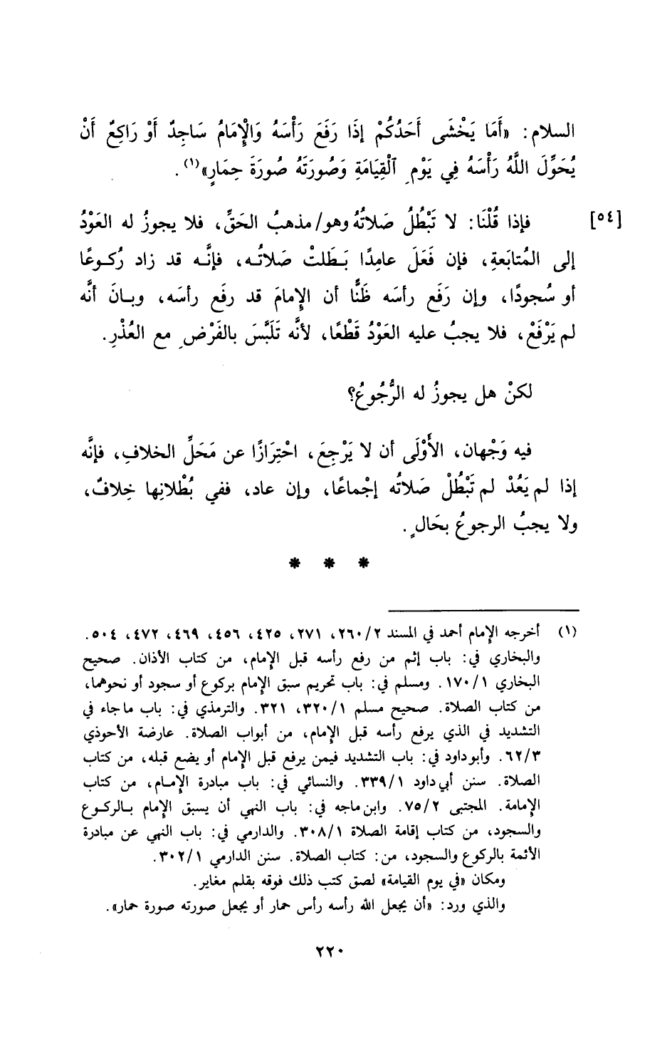 السلام: "أمَا يَخْشَى أحَدُكُم إذا رَفَعَ رَاسَهُ والْإمامُ ساجِدٌ أوْ راكِعٌ أنْ يُحَوِّلَ اللهُ راسَهُ في يومِ الْقِيامَةِ وصُورَتَهُ صُورَةَ حِمارٍ".