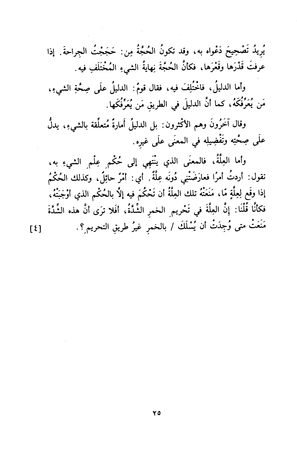 وأما العِلَّةُ، فالمعنى الذي يَنْتَهي إلى حُكْمِ عِلْمِ الشيءِ به، تقول: أردتُ أمرًا فعارَضَتْني دونَه عِلَّةٌ. أي: أمْرٌ حائِلٌ، وكذلك الحُكْمُ إذا وقَعَ لِعِلَّةٍ ما، مَنَعَتْه تلك العِلَّةُ أن تَحْكُمَ فيه إلاَّ بالحُكْم الذي أوْجَبَتْهُ، فكأنَّا قُلْنا: إنَّ العِلَّةَ في تَحْريمِ الخَمْرِ الشِّدَّةُ، أفَلا ترى أنَّ هذه الشِّدَّةَ مَنَعَتْ متى وُجِدَتْ أن يُسْلَكَ بالخمرِ غيرُ طريقِ التحريمِ؟.