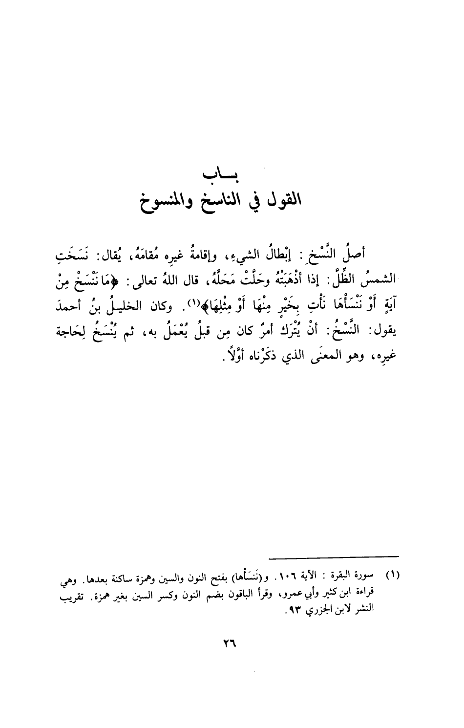 أصلُ النَّسْخِ: إِبْطالُ الشيءِ، وإقامةُ غيرِه مُقامَهُ، يُقالُ: نَسَخَتِ الشَّمسُ الظِّلَّ: إذا أذْهَبَتْهُ وحَلَّتْ مَحَلَّهُ، قال الله تعالى: (ما ننسخْ من آية أو ننسأها نأت بخير منها أو مثلها). وكان الخليلُ بنُ أحمدَ يقول: النَّسْخُ: أنْ يُتْرَكَ أمرُ كان مِن قبلُ يُعْملُ به، ثم يُنْسَخُ لحاجة غيرِه، وهو المعنى الذي ذكَرْناه أوَّلاً.