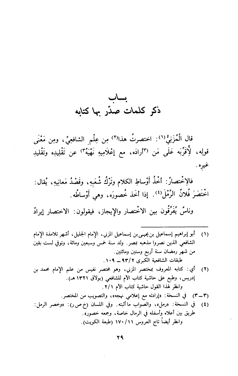 قال المُزَنِيُّ: اختصرتُ هذا من عِلْمِ الشافعيِّ، ومِن مَعْنى قولِه، لأُقَرِّبَهُ على مَن أرادَه، مع إعْلامِيهِ نَهْيَهُ عن تقليدِه وتقليدِ غيرِه.