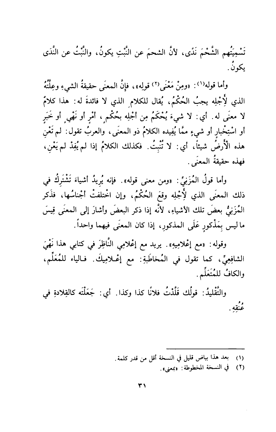 وأما قول المُزَنِيِّ: "ومن معنى قوله". فإنه يُريدُ أشياءَ تشْتَرِكُ في ذلك المعنى الذي لِأجْلِه وَقَعَ الحُكْمُ، وإن اختلفتْ أجناسُها، فذَكَر المُزَنِيُّ بعضَ تلك الأشياءِ، لأنَّه إذا ذكر البعضَ وأشارَ إلى المعنى قِيسَ ما ليس بمذْكورٍ على المذكورِ، إذا كان المعنى فيهما واحداً.