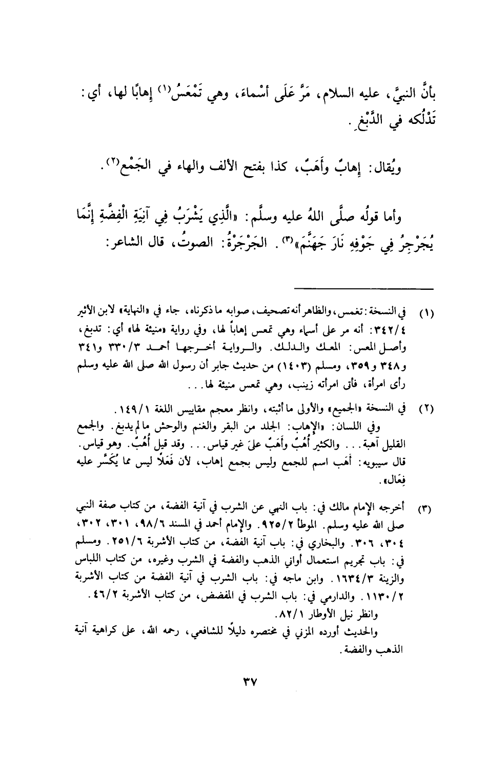 وأما قولُه صلى الله عليه وسلَّم: " الَّذي يَشْرَبُ في آنِيَة الفِضَّةِ إنَّما يُجَرْجِرُ في جَوْفِه نارَ جَهَنَّم". الجَرْجَرَةُ: الصوتُ، قال الشاعر: