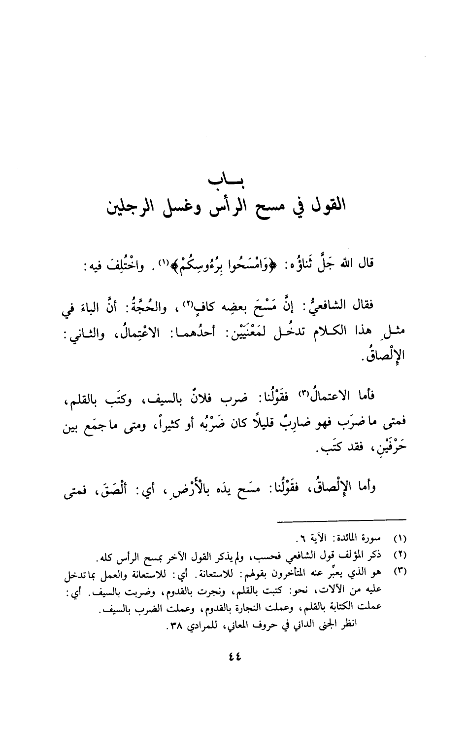 فقال الشافعيُّ: إنَّ مَسْحَ بعضِه كافٍ، والحُجَّةُ: أنَّ الباءَ في مثلِ هذا الكلام تدخُلُ لمَعْنَيَيْن: أحدُهما: الاعْتِمالُ، والثاني: الإلْصاقُ.