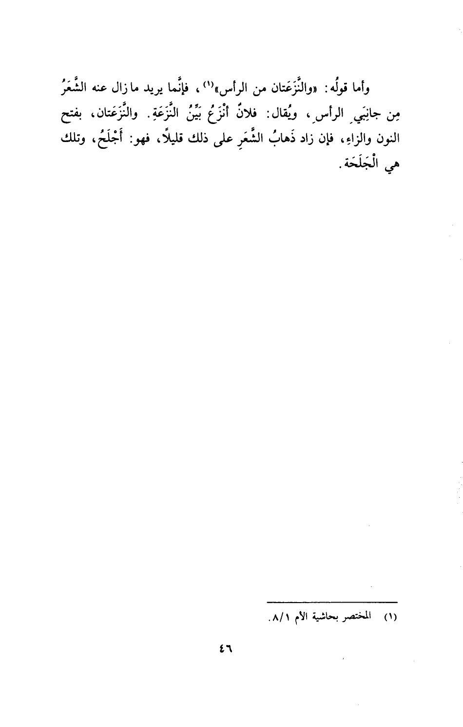 وأما قولُه: "والنَّزَعَتان من الرأس"، فإنَّما يريد ما زال عنه الشَّعَرُ مِن جانِبَيِ الرأسِ، ويُقال: فلانٌ أنْزَعُ بَيِّنُ النَّزَعَةِ. والنَّزَعَتان، بفتح النون والزاء، فإن زاد ذَهابُ الشَّعَرِ على ذلك قليلاً، فهو: أَجْلَحُ، وتلك هي الْجَلَحَة.