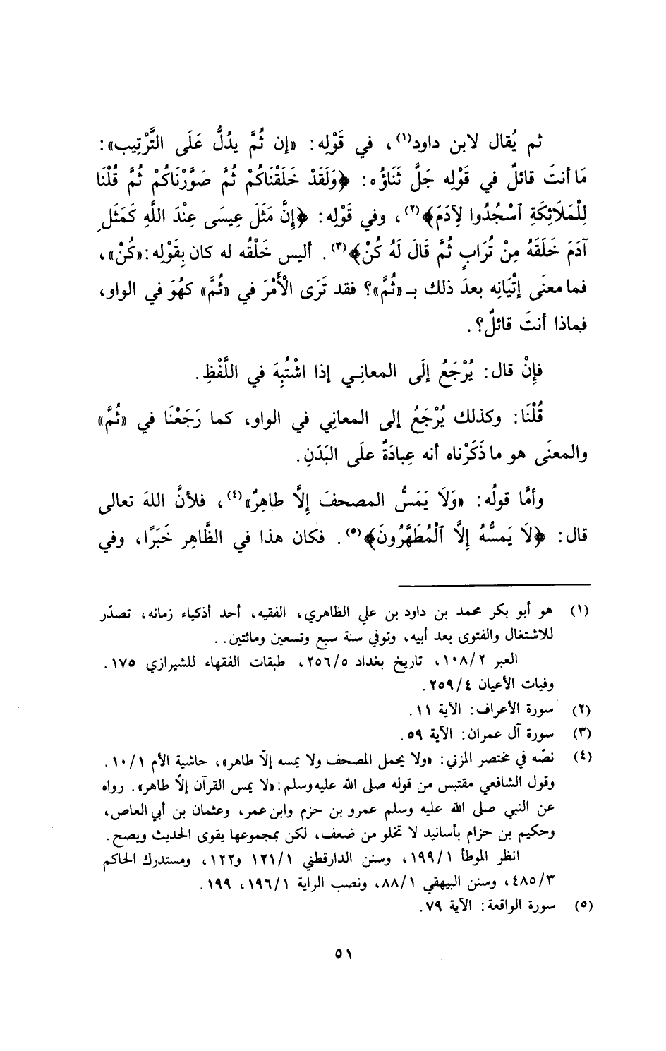 ثم يُقال لابن داود، في قولِه: "إن ثُمَّ يَدُلُّ على التَّرْتيب": ما أنتَ قائِلٌ في قَوْلِه جَلَّ ثَناؤُه: (ولقد خلقناكم ثم صورناكم ثم قلنا للملائكة اسجدوا لآدم)، وفي قوله: (إن مثل عيسى عند الله كمثل آدم خلقه من تراب ثم قال له كن). أليس خَلْقُه له كان بِقَوْلِه: "كُنْ"، فما معنى إِتْيانِه بعد ذلك بـ"ثُمَّ"؟ فقد تَرَى الأمرَ في "ثُمَّ" كهُوَ في الواو، فماذا أنتَ قائلٌ؟.