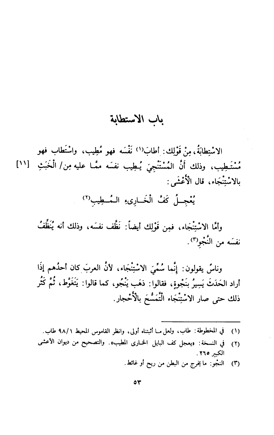 الاسْتِطابَةُ، مِنْ قَوْلِك: أطابَ نَفْسَه فهو مُطِيب، واسْتَطابَ فهو مُسْتَطيب، وذلك أنَّ المُسْتَنْجيَ يُطيب نفسَه ممَّا عليه مِن الْخَبَثِ بالاسْتِنْجاء، قال الأعْشى: