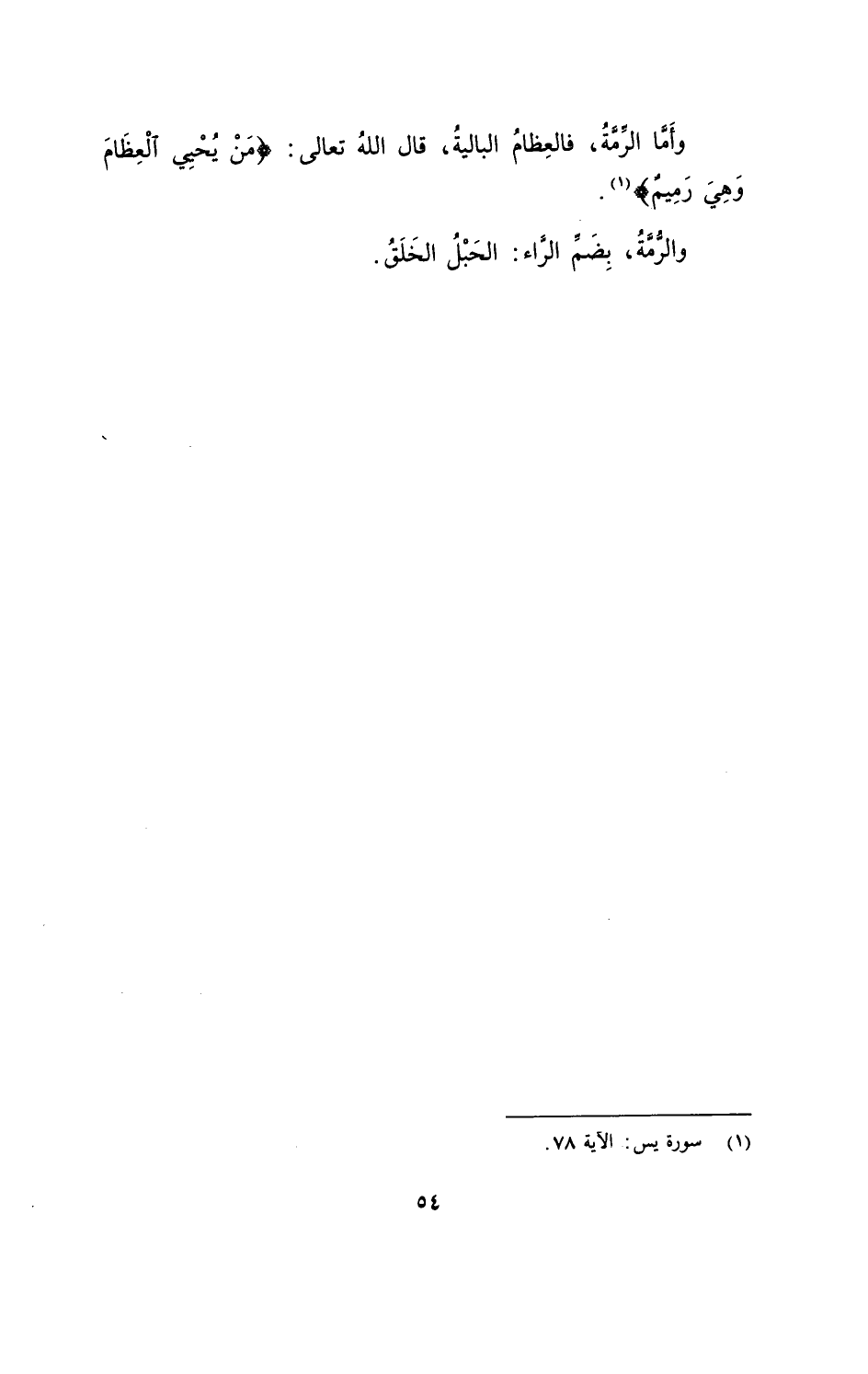 وأمَّا الرِّمَّةُ، فالعِظامُ الباليةُ، قال الله تعالى: (مَنْ يُحْيي العِظامَ وَهِيَ رَمِيم).
