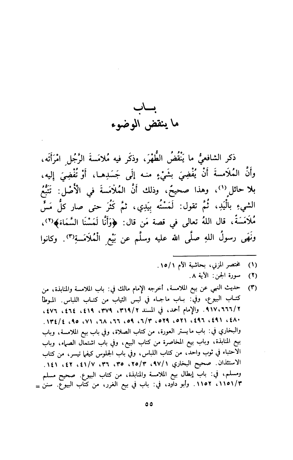 ذكر الشافعيُّ ما يَنْقُضُ الطُّهْرَ، وذَكَرَ فيه مُلامَسَةَ الرَّجُلِ امْرأتَه، وأنَّ المُلامَسَةَ أنْ يُفْضِيَ بِشَيْءِ منه إلى جَسَدِها، أوْ تُفْضِيَ إليه، بلا حائِل، وهذا صحيحٌ، وذلك أنَّ المُلامَسَةَ في الْأَصْلِ: تَتَّبُعُ الشيءِ بالْيَدِ، ثُمَّ تقول: لَمَسْتُه بِيَدِي، ثمَّ كَثُرَ حتى صار كلُّ مَسٍّ مُلامَسَةً، قال الله تعالى في قصة مَنْ قال: (وأنَّا لَمَسْنا السَّماء)، ونَهَى رسول الله صلى الله عليه وسلم عن بَيْعِ الْمُلامَسَةِ. وكانوا