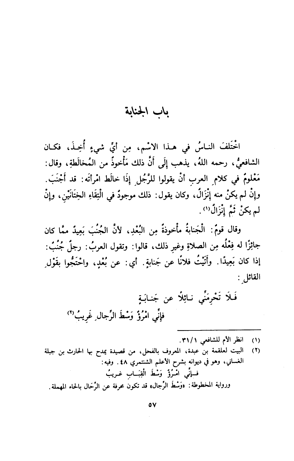 وقال قومٌ: الْجَنابةُ ماخوذَةٌ مِن البُعْدِ، لأنَّ الجُنُبَ بَعيدٌ ممَّا كان جائِزًا له فِعْلُه مِن الصلاةِ وغيرِ ذلك، قالوا: وتقول العربُ: رجلٌ جُنُبٌ: إذا كان بَعيدًا. وأتَيْتُ فلانًا عن جَنابةٍ. أي: عن بُعْدٍ، واحْتَجُّوا بقَوْلِ القائلِ: