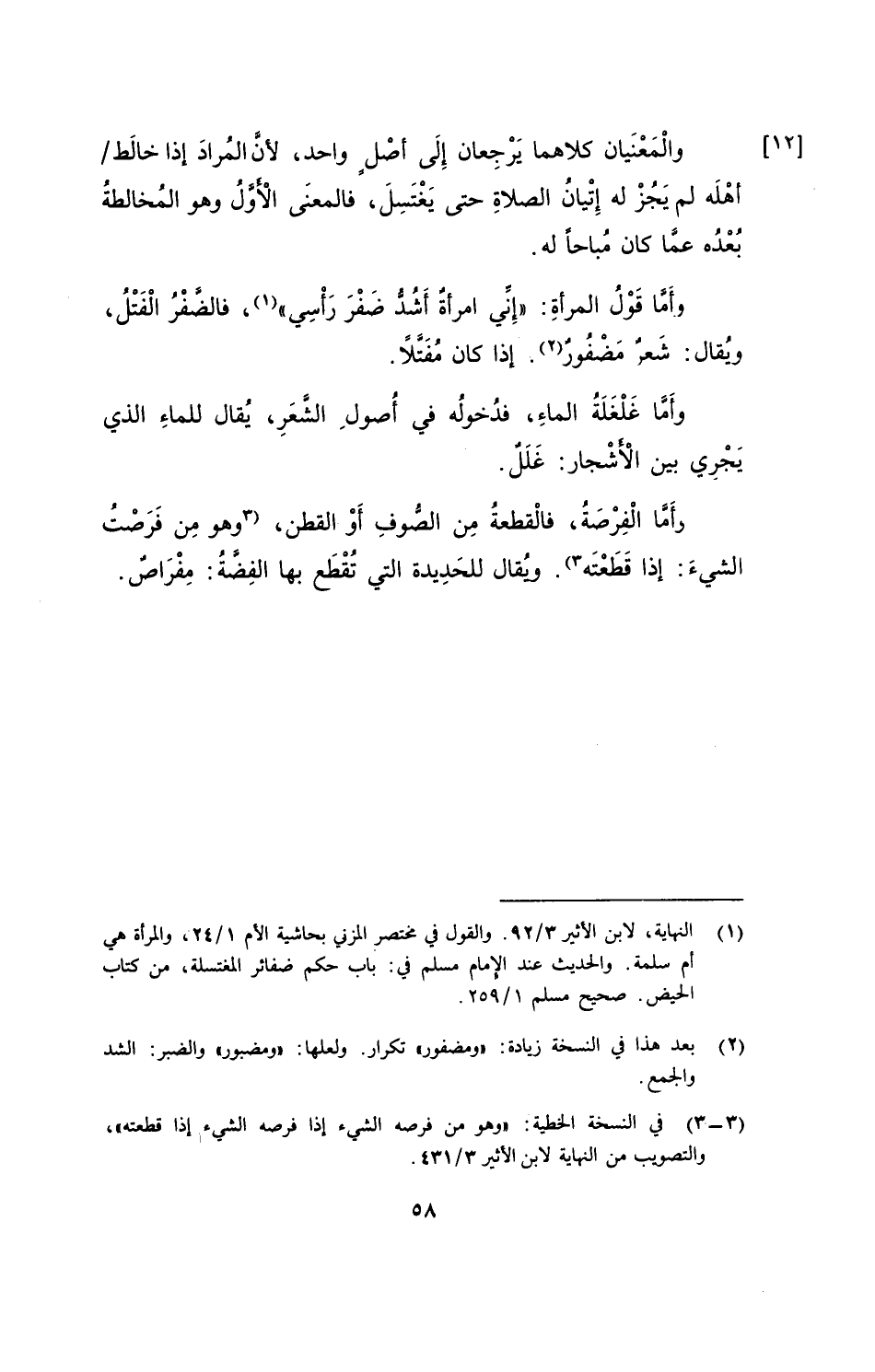 وأمَّا قَوْلُ المرأةِ: "إنِّي امرأةٌ أَشُدُّ ضَفْرَ رَاسِي"، فالضَّفْرُ الْفَتْلُ، ويُقال: شَعرٌ مَضْفُورٌ. إذا كان مُفَتَّلاً.