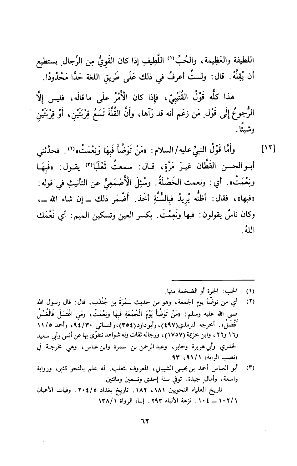 وأمَّا قَوْلُ النبيِّ عليه السلام: "مَنْ تَوَضَّأ فَبِها وَنِعْمَتْ". فحدَّثني أبو الحسن القَطَّان غيرَ مَرَّةٍ، قال: سمعتُ ثَعْلَبًا يقول: "فَبِها ونِعْمَتْ". أي: ونعمت الخَصْلَةُ. وسُئِلَ الْأَصْمَعِيُّ عن التأنيثِ في قوله: "فبها"، فقال: أظنُّه يُريدُ فبالسُّنَّةِ أخَذَ. أَضْمَرَ ذلك -إن شاء الله-، وكان ناسٌ يقولون: فبها ونَعِمْتَ. بكسر العين وتسكين الميم: أي نَعَّمَك اللهُ.
