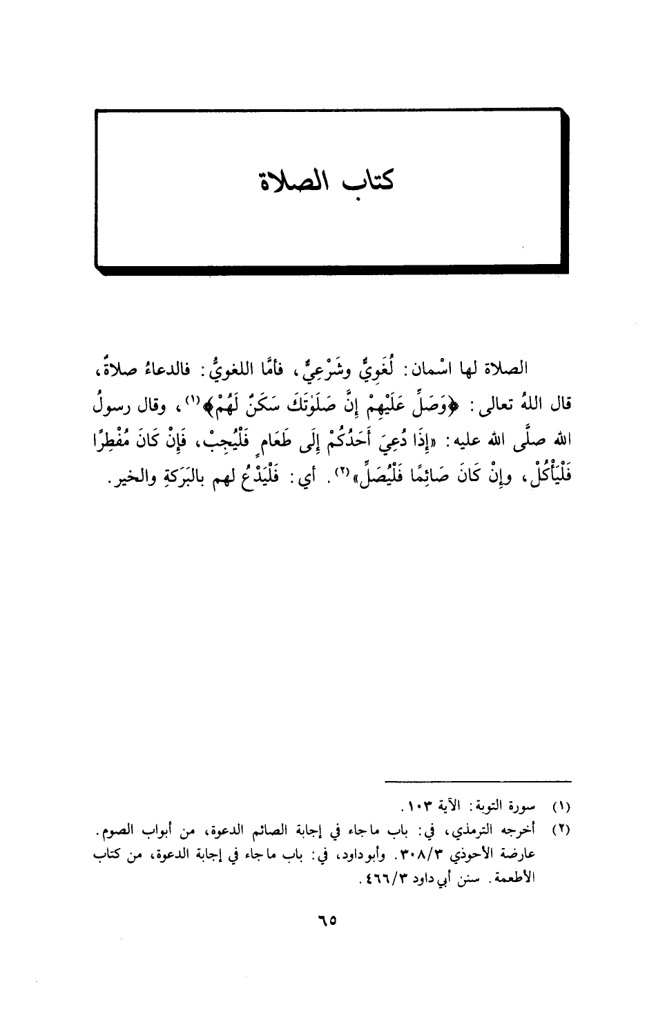 الصلاة لها اسْمان: لُغَوِيٌّ وشَرْعِيٌّ، فأمَّا اللغويُّ: فالدعاءُ صلاةٌ، قال الله تعالى: (وصلِّ عليهم إنَّ صلواتك سَكَنٌ لهم)، وقال رسول الله صلَّى الله عليه: "إذا دُعِيَ أحدُكم إلى طَعامٍ فَلْيُجِبْ، فإنْ كانَ مُفْطِرًا فَلْيَأكُلْ، وإنْ كانَ صائمًا فَلْيُصَلِّ". أي: فَلْيَدْعُ لهم بالبَرَكَةِ والخير.